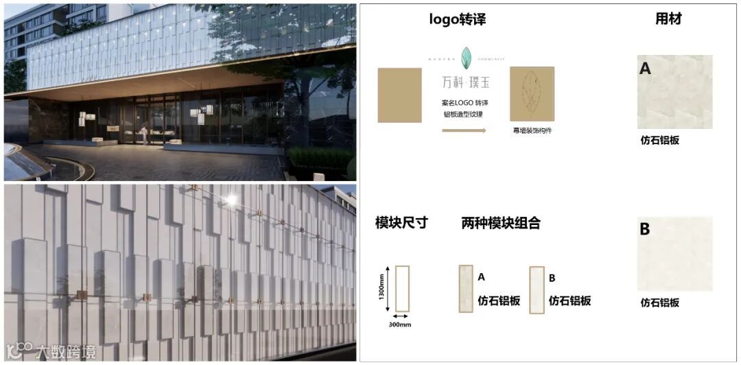 立面幕墙装饰构件,由案名LOGO转译成铝板造型纹理,整体几何形态以“玉章”为原型,选取两种仿石铝板模块组合,精准拿捏其比例与节奏韵律,创造“淡妆相宜”的建筑美学。