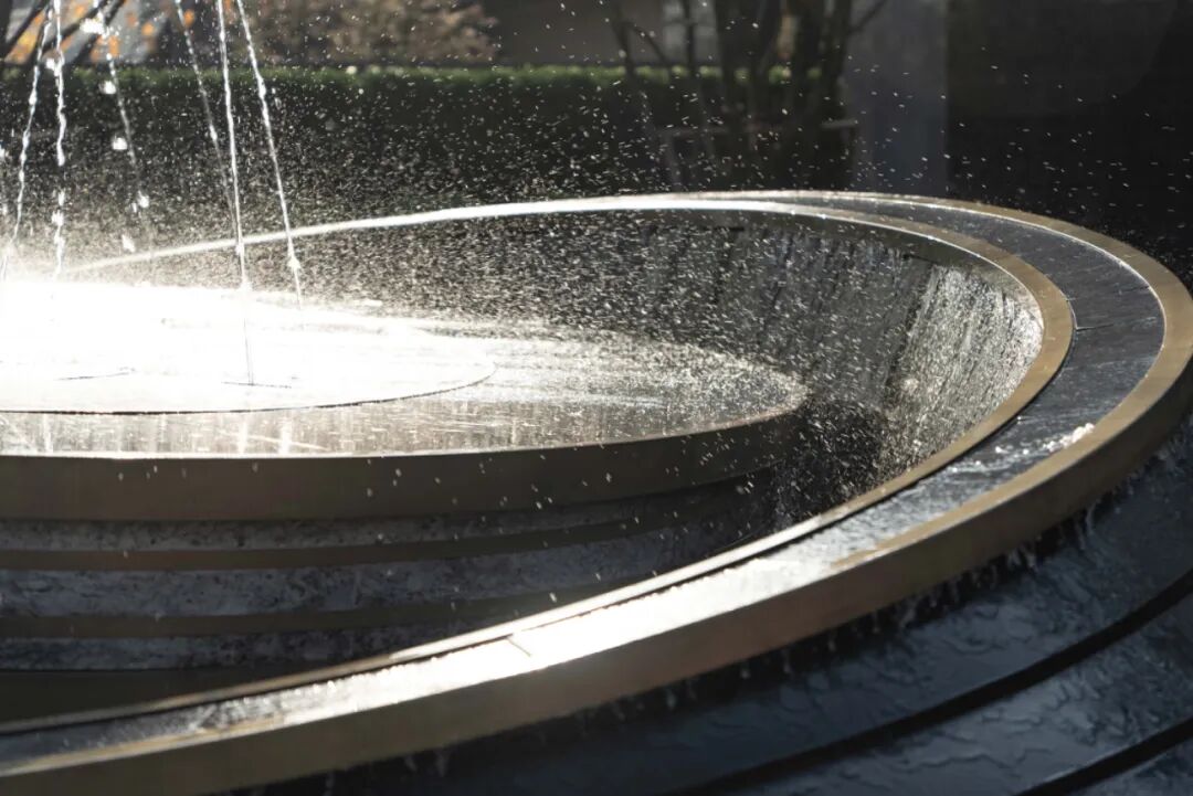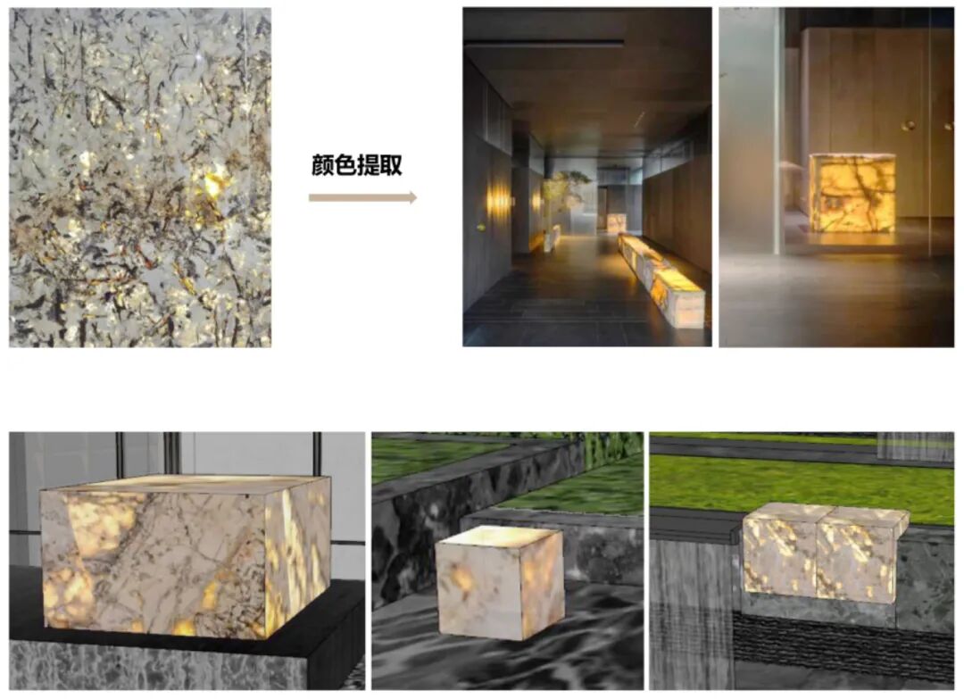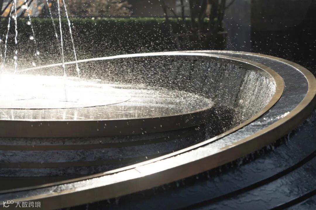 地面铺装采用玉纹衍生的回字式样,雕塑造型为玉环相扣、玉盘落珠,在潺潺水声中流露出萃玉风雅与美好祝愿。