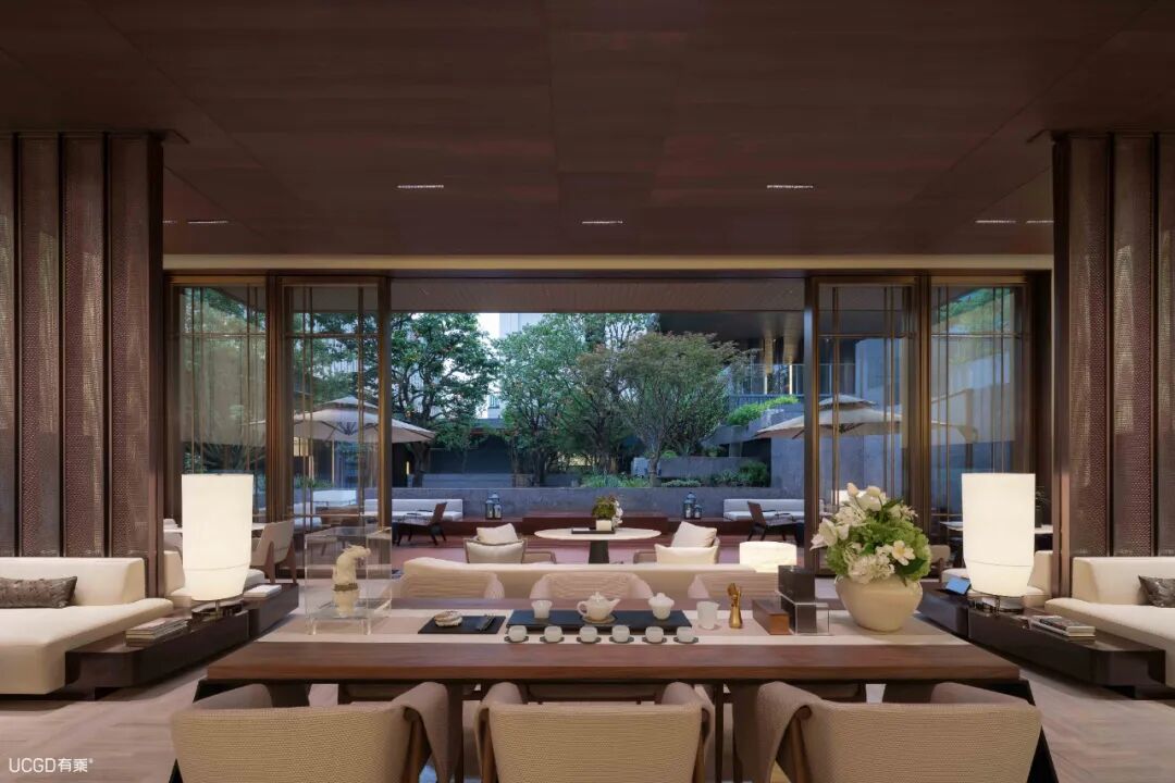 建筑内部,约4.8米的酒店大堂级挑高,搭配漆画等独具东方美学的装饰,增添中式国韵。会客空间内,以简约素雅为主基调,木色搭配浅色软包,浓淡相宜,构造静逸素雅的画面。