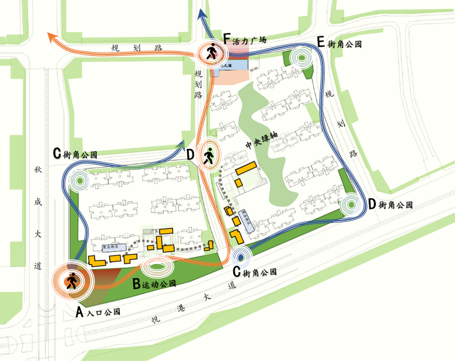 ▲T字型轴线串联起街区、公园、社区等全生活场景,构建慢行系统。