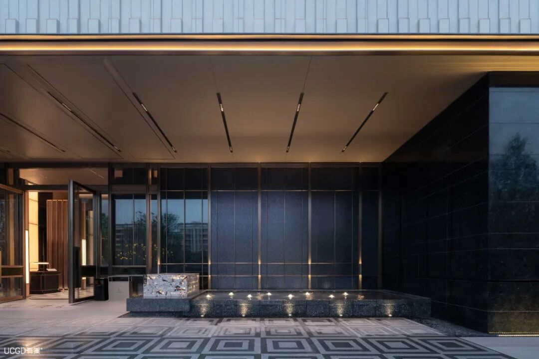 单元入户门头采用大尺度挑檐设计,墙面色泽深沉而典雅,搭配泛光灯具,精工品质将仪式感一路铺陈。