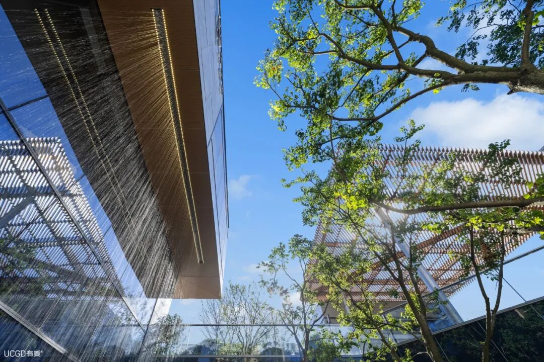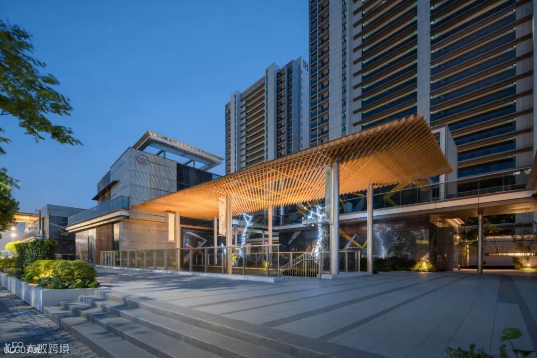 入口处超大跨度雨棚设计,有着轻盈而有力的几何走势,「玻璃顶棚+木纹格栅」以一种开放的姿态欢迎人们的亲临。