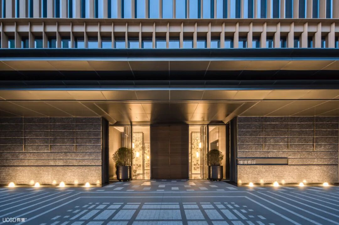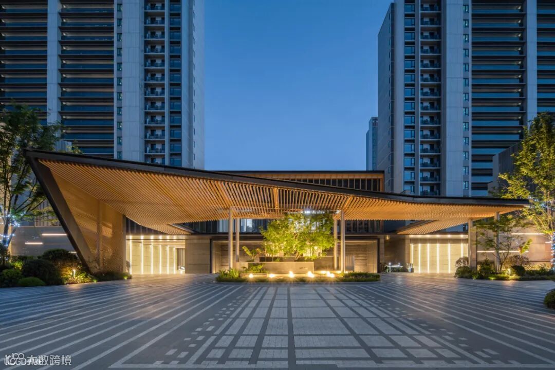 小区大堂与车行入口一体化设计,车行道闸内退推到建筑里,而中心的叠水景墙,形成酒店式的洄游落客门厅。