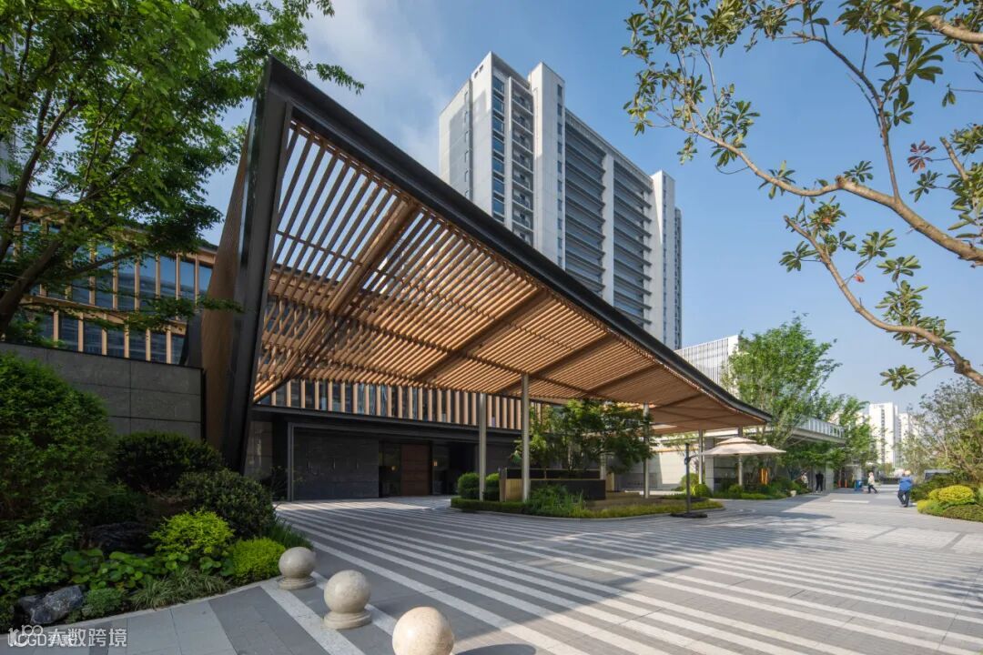 B区入口延续着木纹雨棚构架,将社区界面充分打开与城市共享,通过大开放、小封闭的设计,消融街区与城市之间的边界。