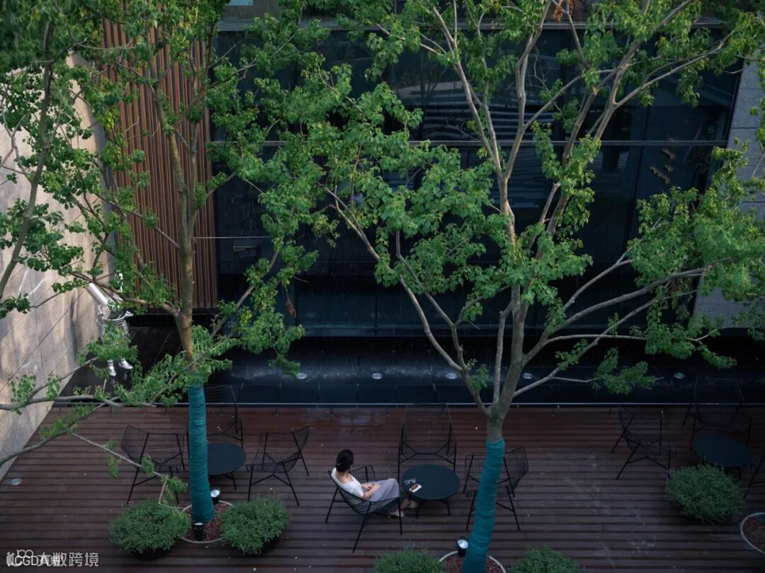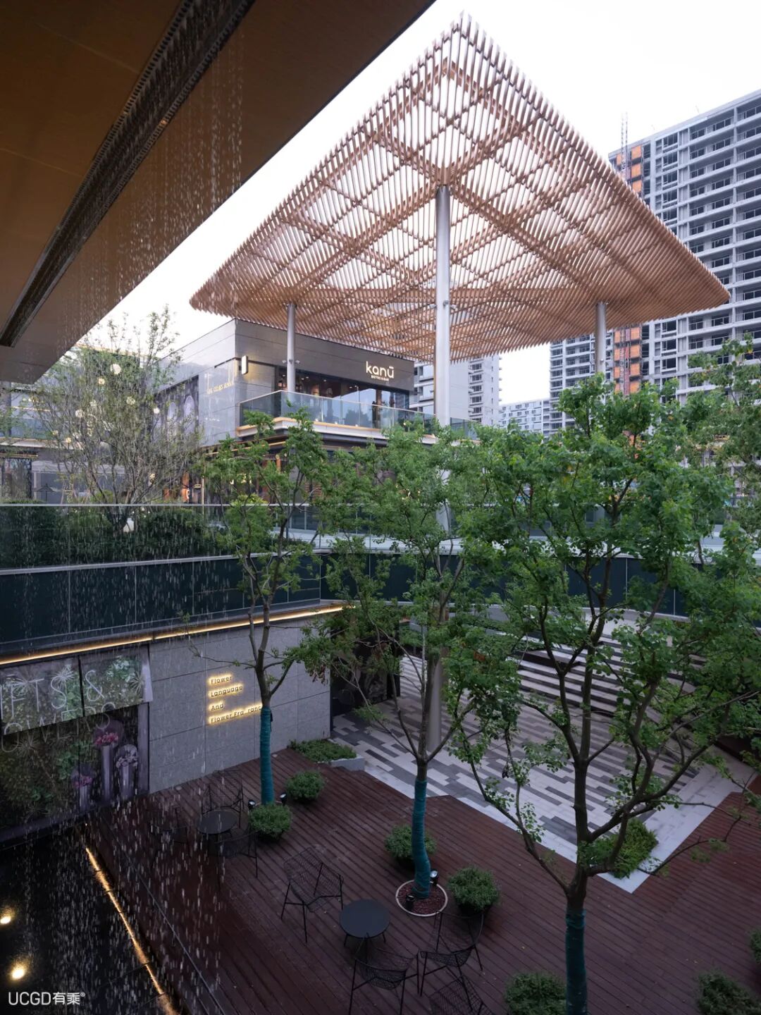 雨棚下,是下沉式水幕庭院。瀑布、流水、密林、坐凳......构建一座都市自然林屿,营造出一处静谧的场域精神。