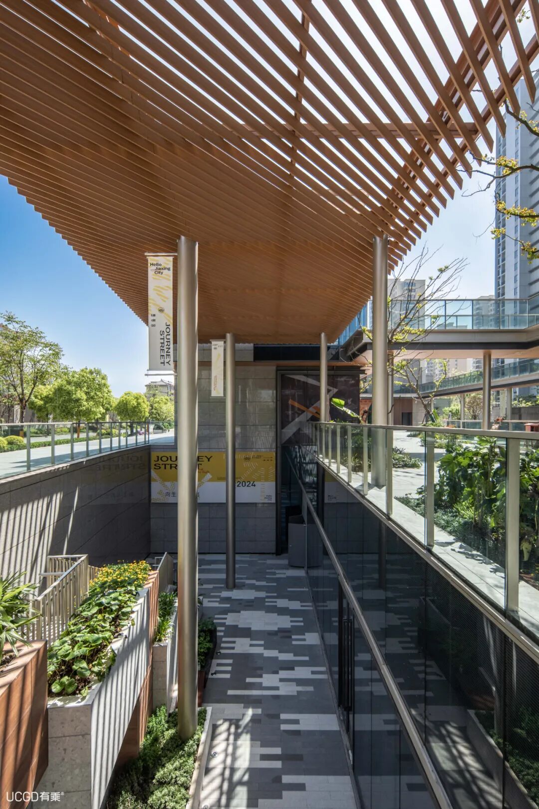 转角主广场上,昭示感极强的木纹大雨棚,为街区带来温暖柔韧的舒适底色。负责结构支撑的银灰钢柱又为整体中和精致冷感,带来大气又柔韧的秩序美。