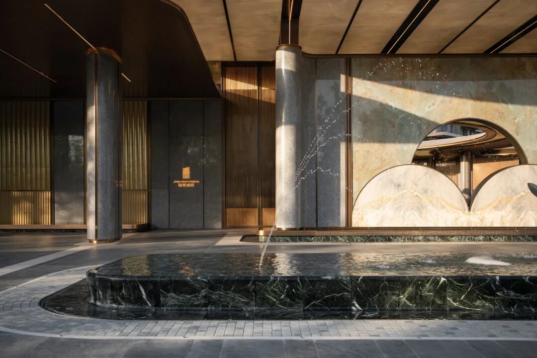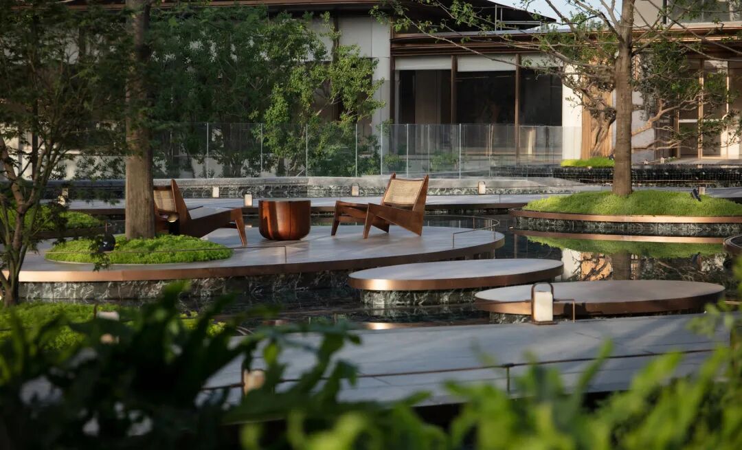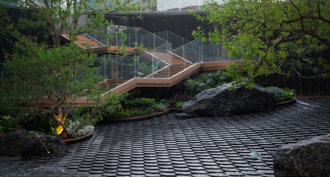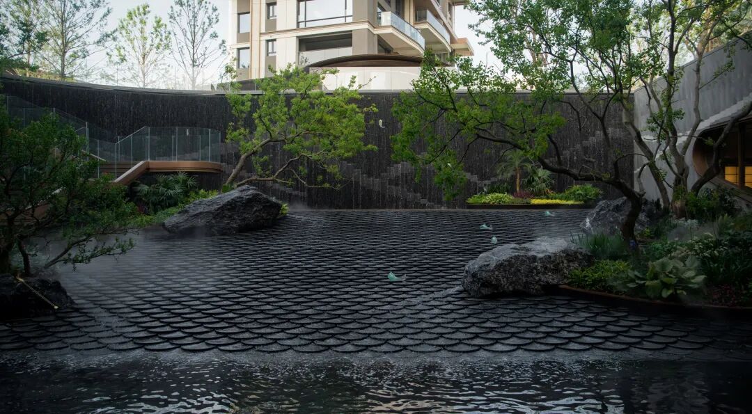 从会所望出去,飞流而下的瀑布与缓缓流动的溪流,营造出高山流水的意境之美。下沉水院的鱼鳞铺装每一片都展现了精工细节,在水流的加持下波光粼粼。