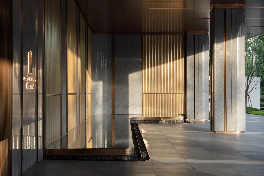 阳光洒向主入口门廊,将石材的温润雅致和金属精致的质感体现的淋漓尽致,也为主入口增添一份空间层次感。