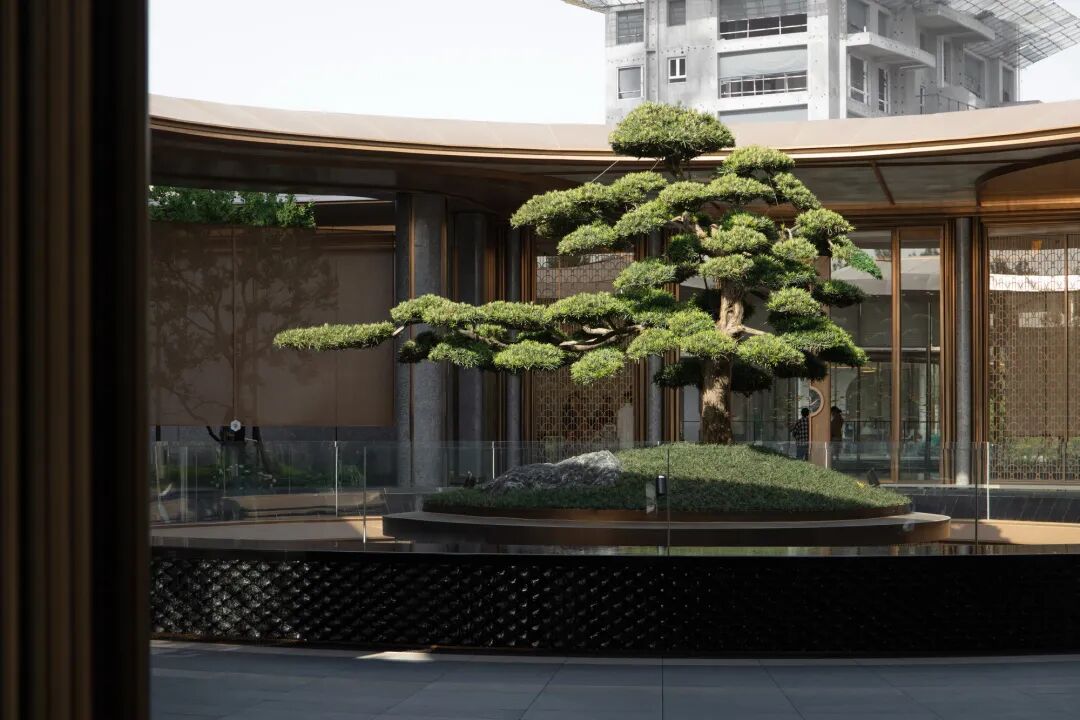 穿过入口门廊漫步于迎宾松园,静心品松,在圆形的围合空间中感受游于庭院的东方美学,置身于此,仿若将世外的喧嚣隔绝在门廊之外。庭院中植一棵松,高洁清雅的气质让人豁然开朗,脱离世俗。