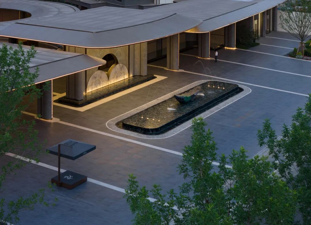 以玉为元素作为主入口点景雕塑,彰显主入口的尊贵感和仪式感。普拉达绿的迎宾水景之上漂浮着船形雕塑,由琉璃与泰山石精工雕琢融合打造,以景观的方式诠释一帆风顺的美好寓意。