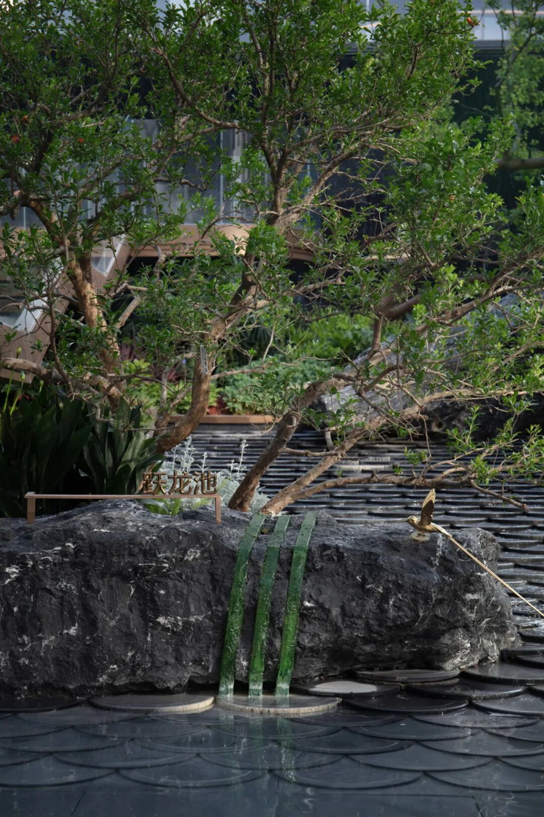 松院龙鳞水景采用黑金沙石材立体雕刻一体成型,端庄沉稳,犹如龙身盘踞其中,守护松树万古长青,强调仪式感及尊贵感。