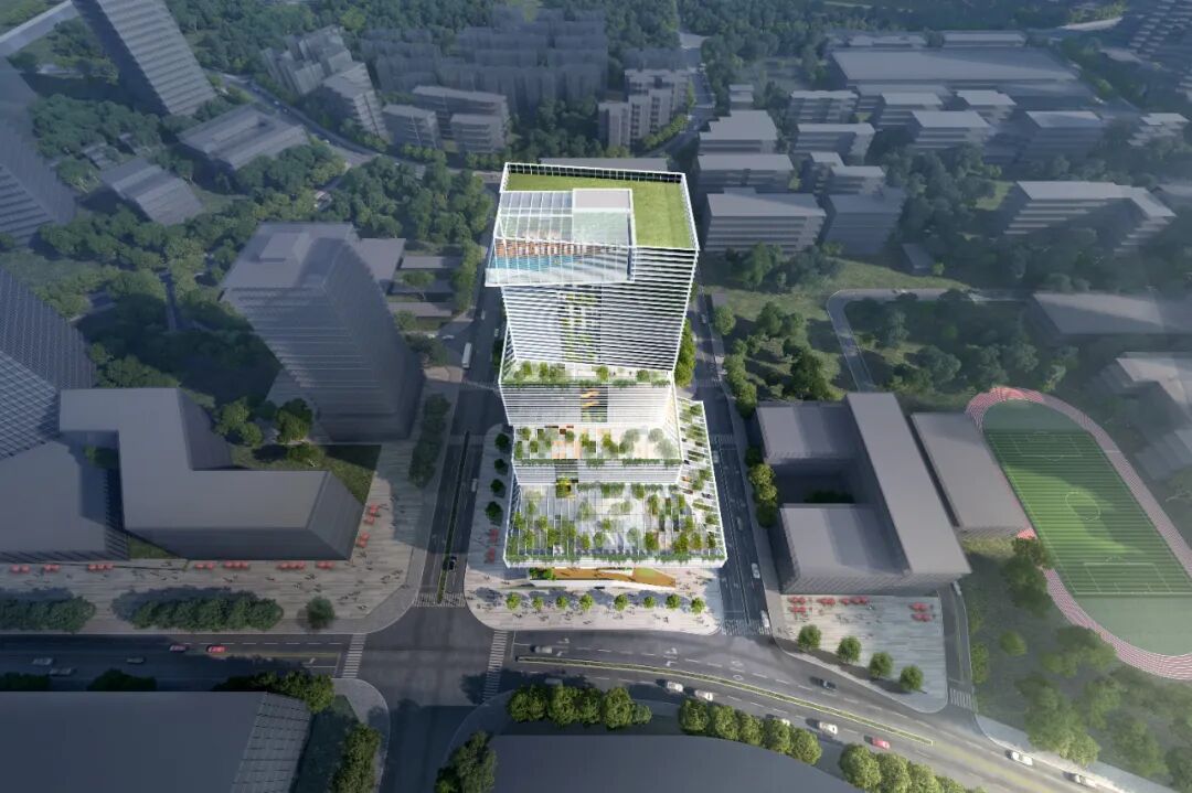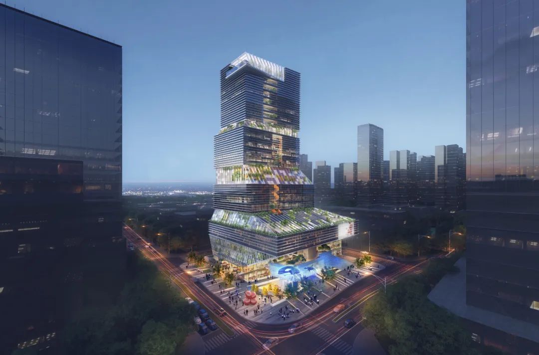 通过形体和空间穿插折叠的手法,将生态共享空间植入不同组团高度,实现工作与生活的渗透,办公与休闲的互动,商务与时尚的接驳,以创新空间和活力空间设计,再次践行产城一体的理念。
