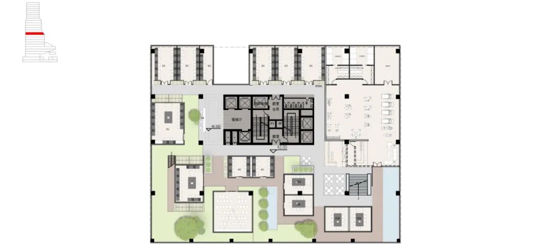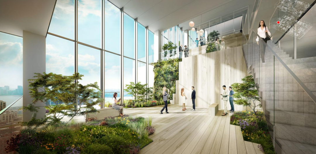 绿色办公空间,利用空中庭院、透空,将自然绿化引入每户,每层都有亲近自然庭院花园。