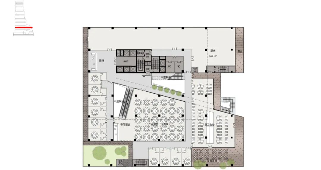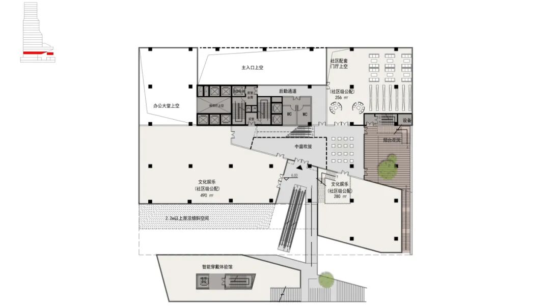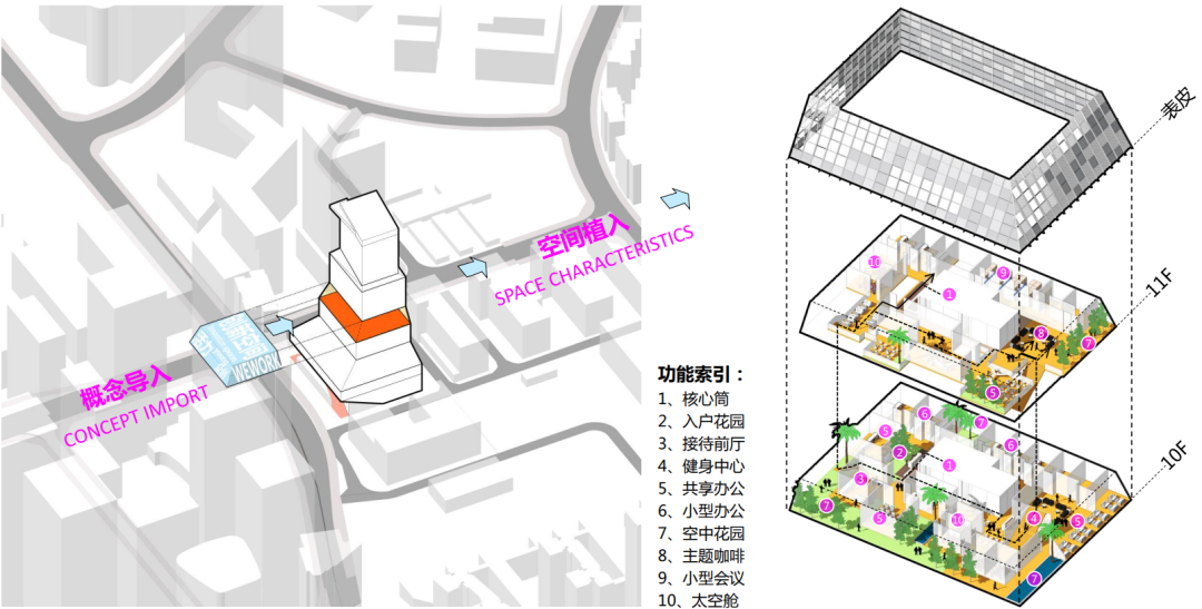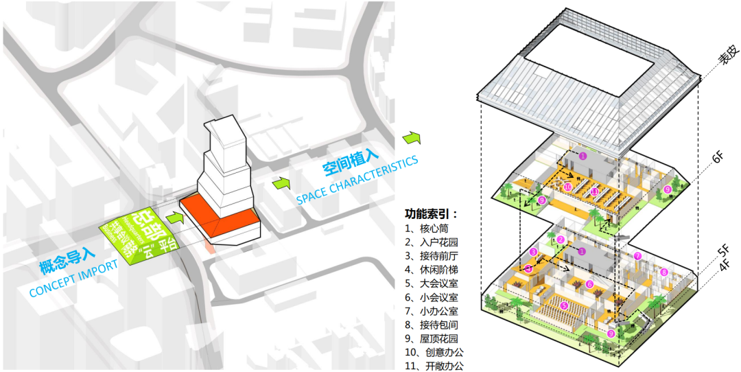 为打破行业壁垒,避免孤立存在,面向小微企业及创业团队,包含共享办公,花园咖啡、太空舱等配套设施,将其成为全楼的孵化器。