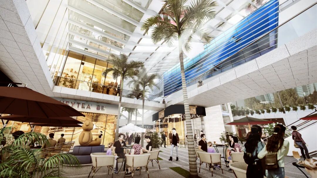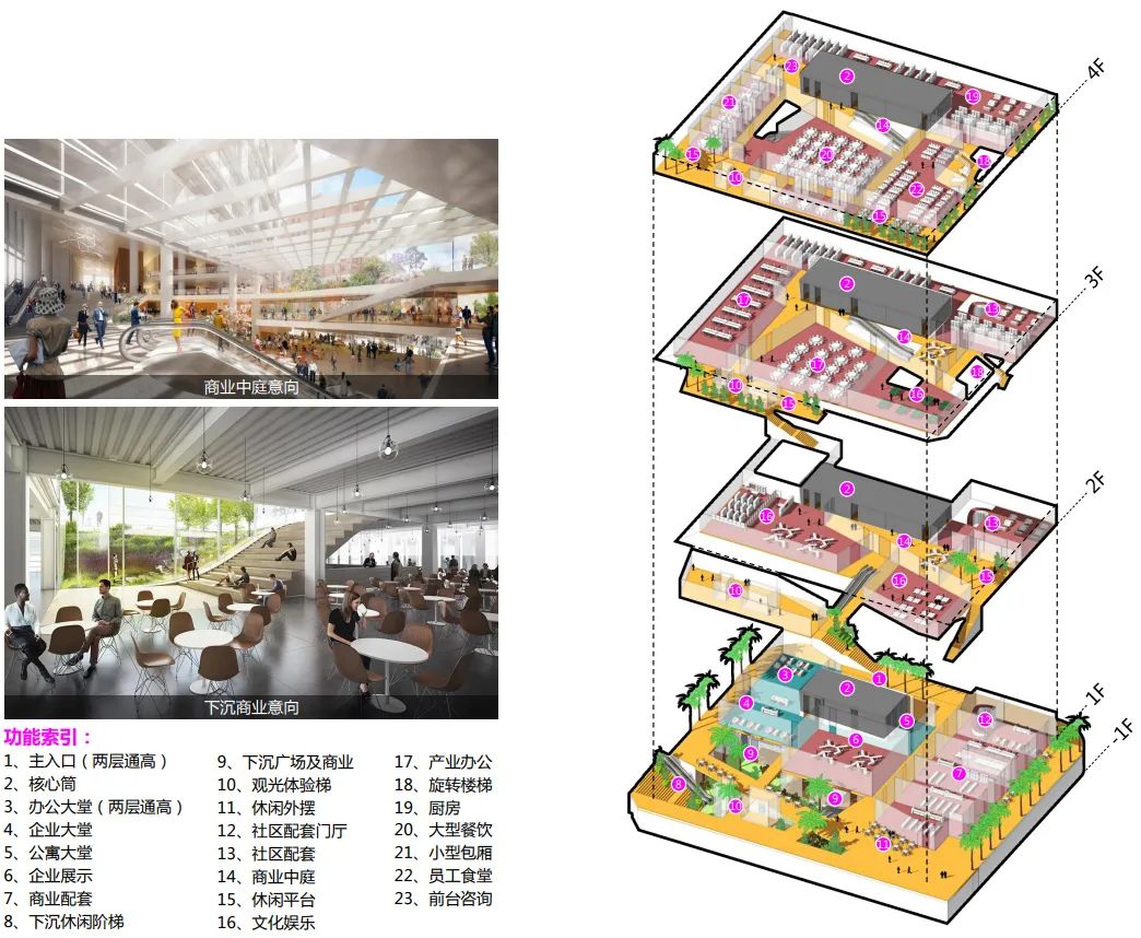建筑的一至四层,尽可能多的产业用房转商业,通过中庭扶梯退台,创造特色环形商业动线,营造综合商业氛围。