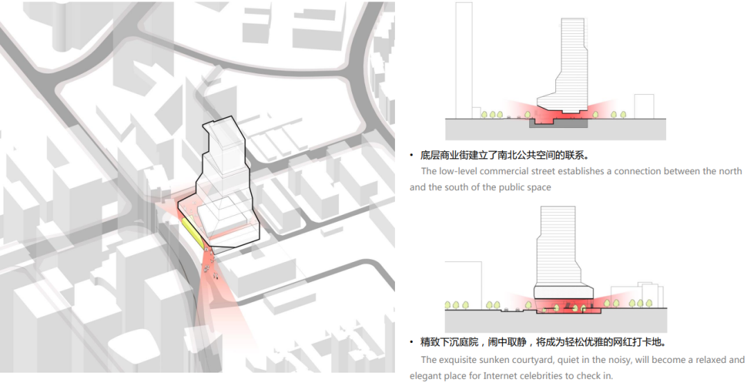 通过架空释放首层场地、提升项目的公共性。弱化场地的高差,拓展地下商业空间,打造双首层、公共开放的廊桥公园,容纳多样城市生活,激发城市活力,凝聚城市记忆。