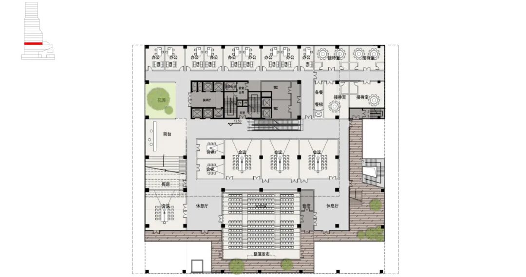 塔楼退让南侧现有建筑,保证通风采光,使办公楼获得最大城市展示面。通过退台等绿化空间,进一步弱化南侧影响。