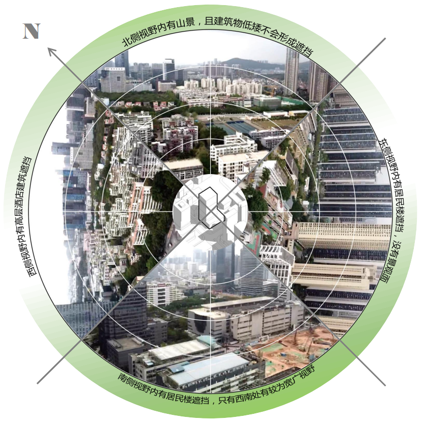 西南侧建筑形成局部视线遮挡,低区视感不佳,但高区视野开阔,且视野内建筑极具层次感, 故在西南设立办公区域营造良好的视野环境。