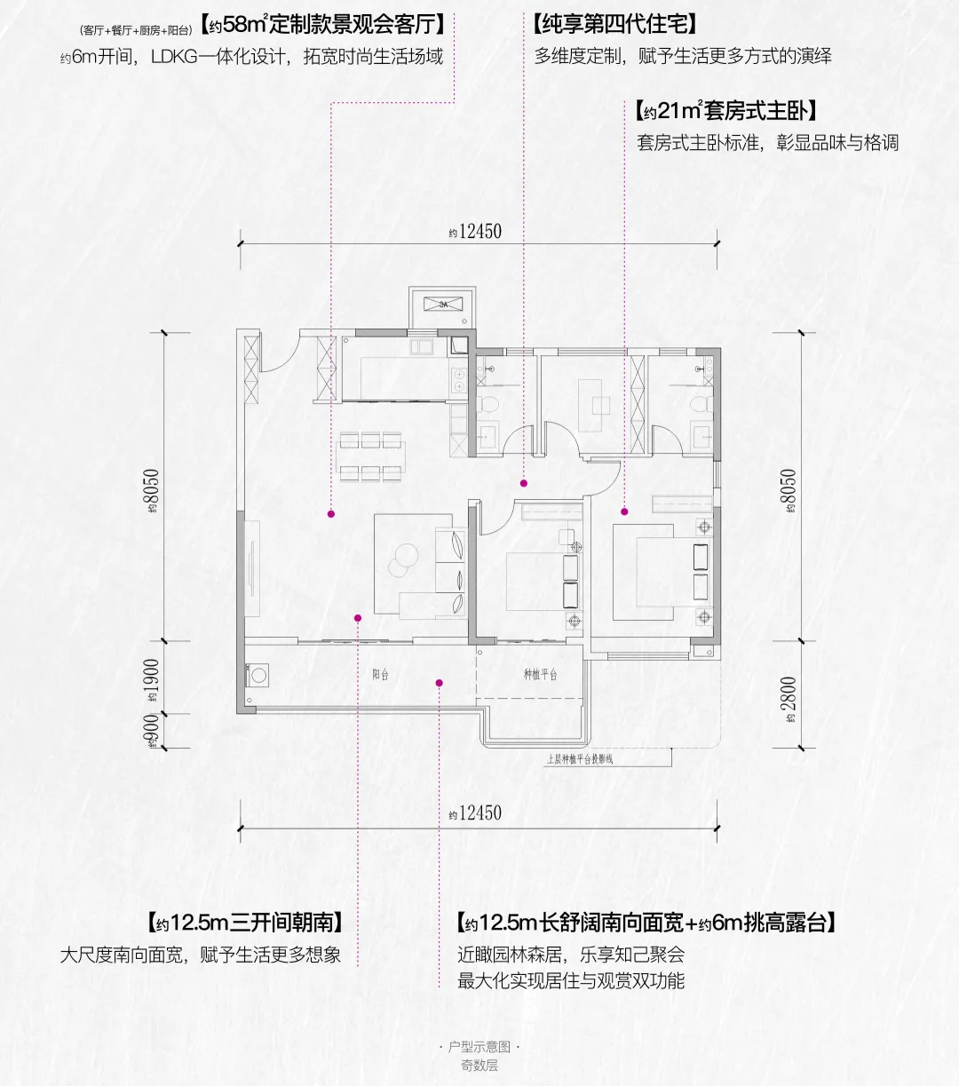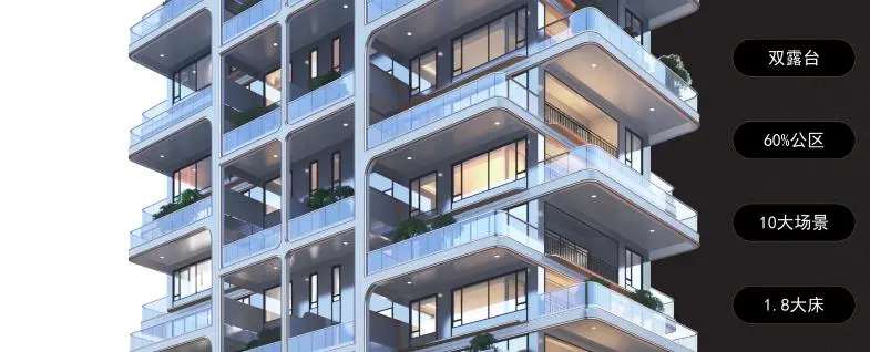 以错层露台创新设计,实现户户空中庭院。创新露台(不计容)、阳台(半计容),观景视野、采光尺度更优越,针对社交性极强的室内公厅,采用LDKB设计构建多样生活场景。