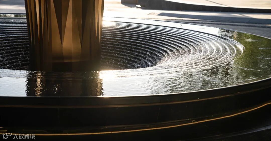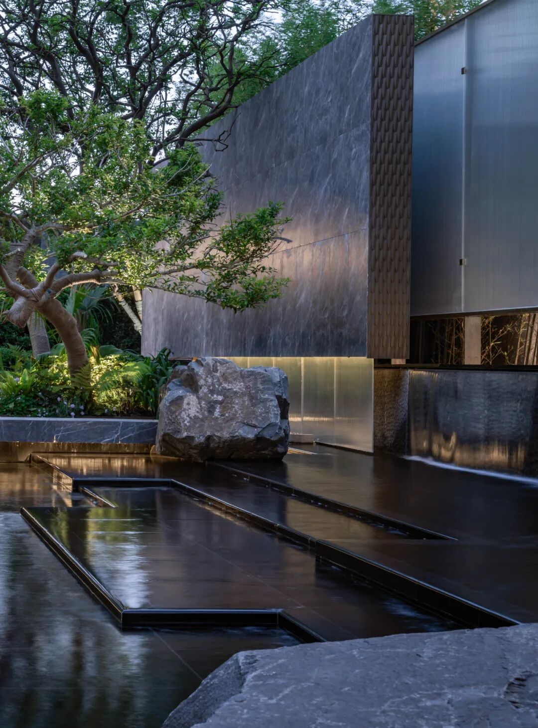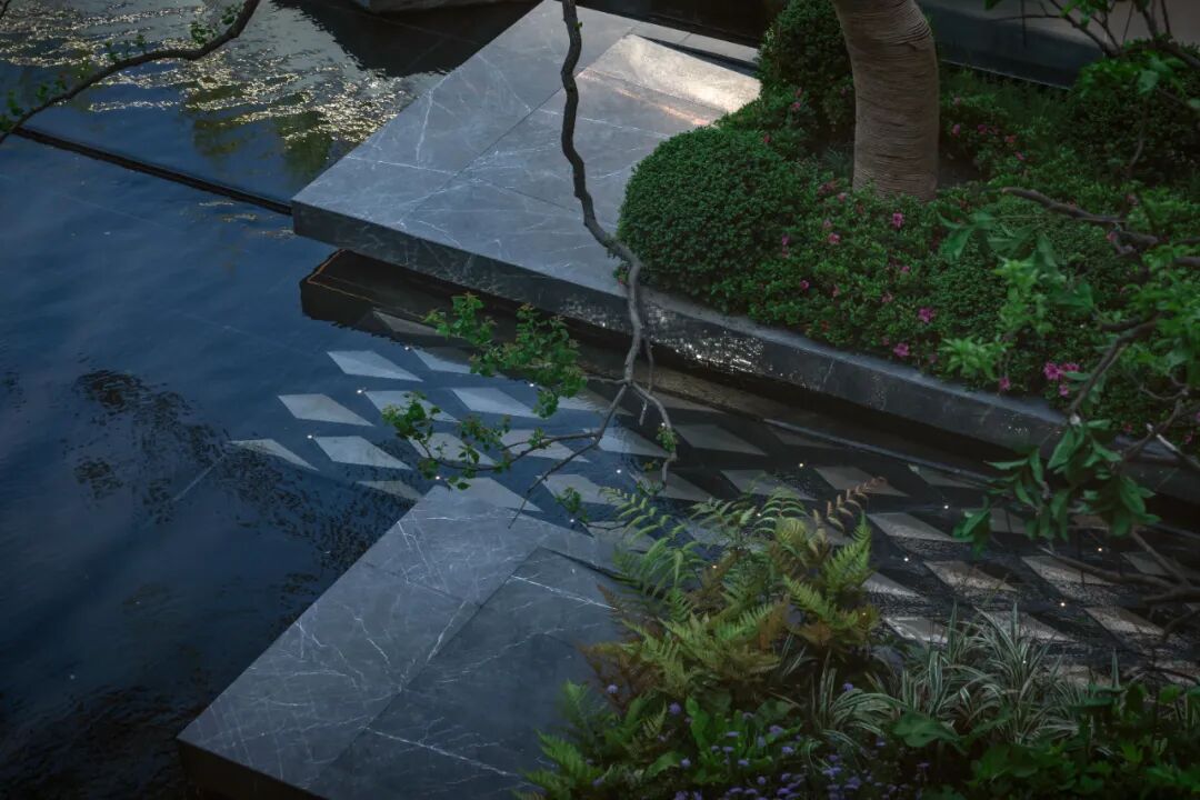在水池底部的设计中亦是如此。水池的波纹与菱形图案相互交织,当微风拂过,水面泛起层层涟漪,让水池更加生动有趣,并带上生命的意韵。