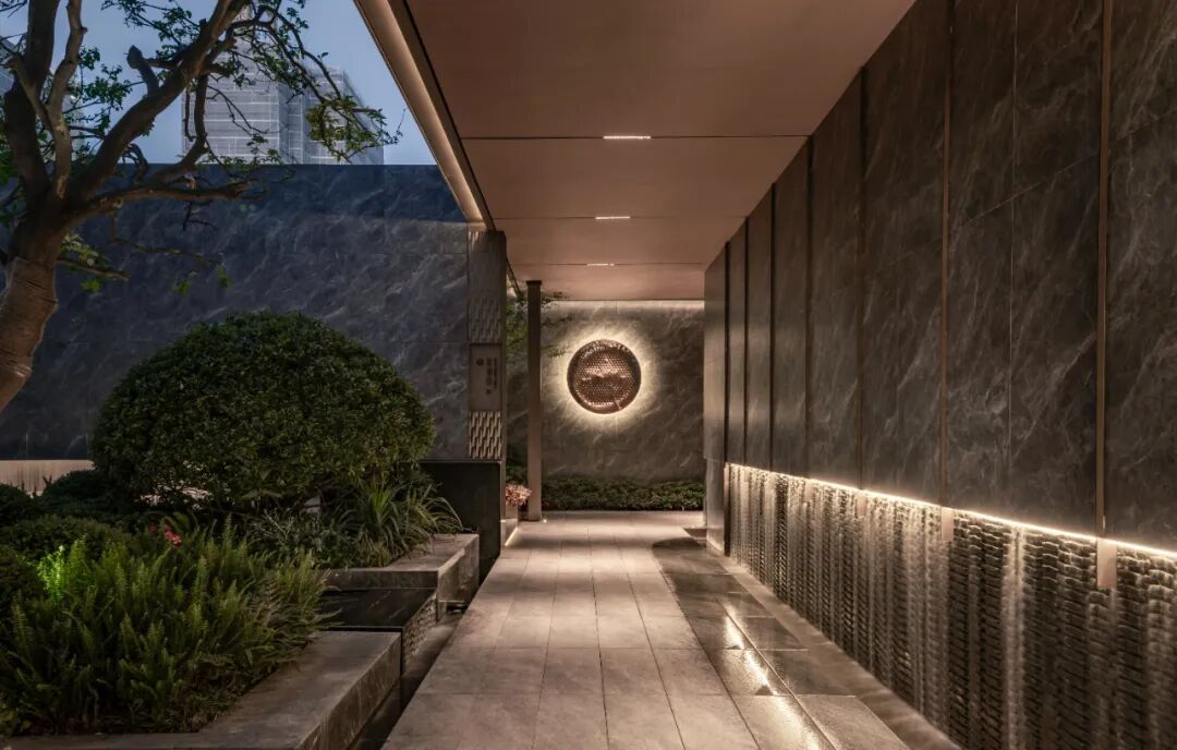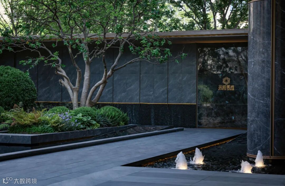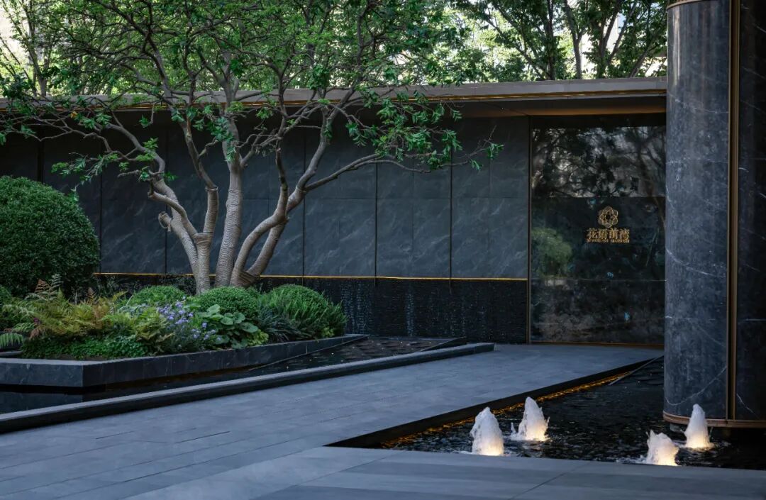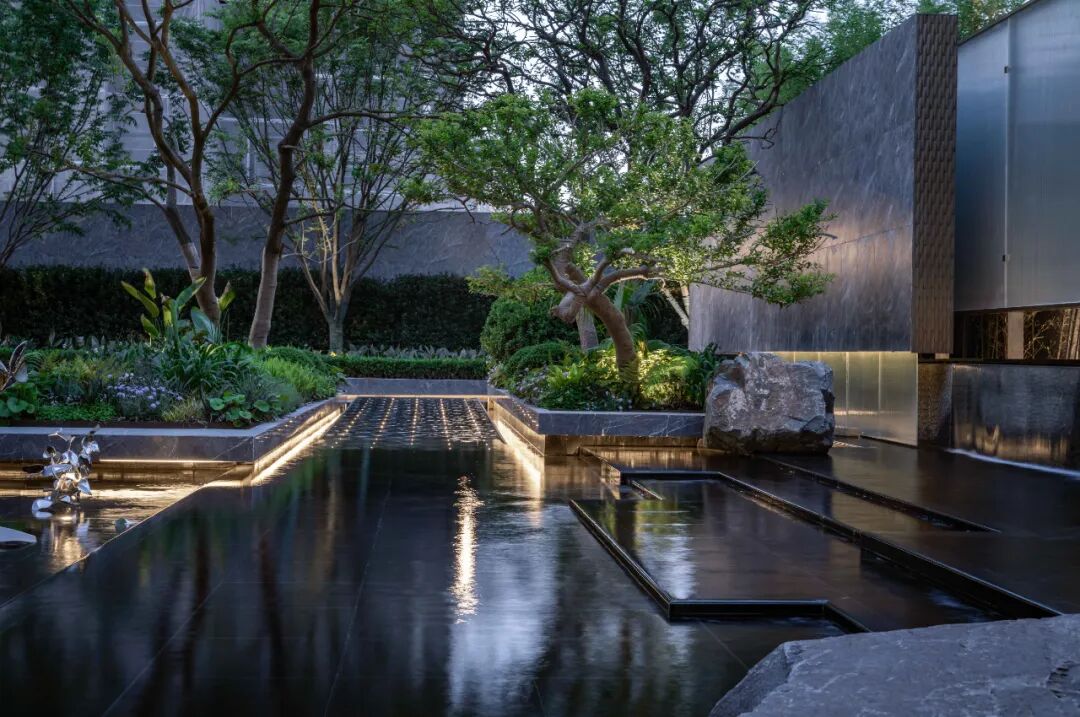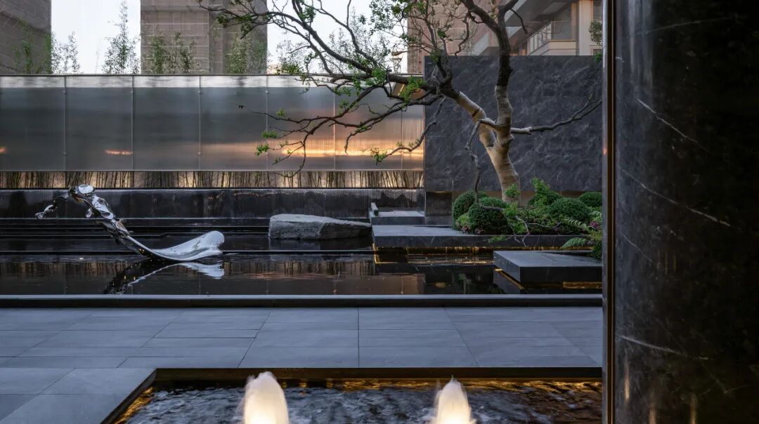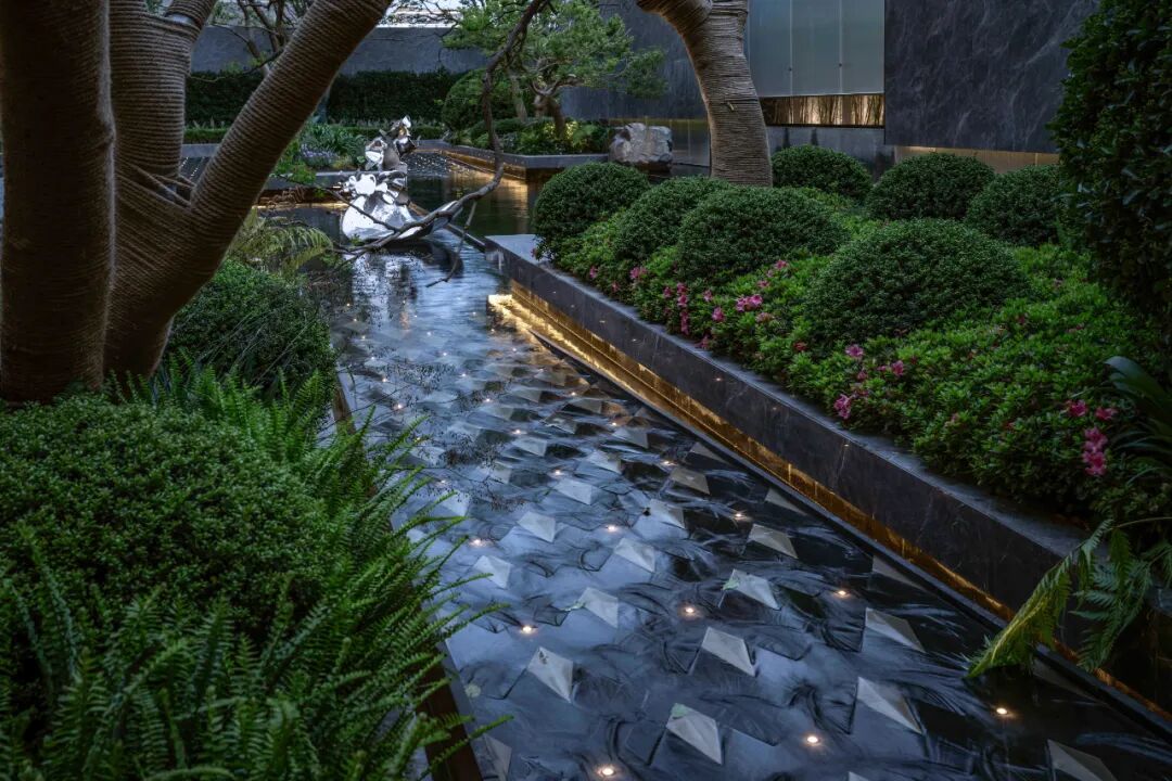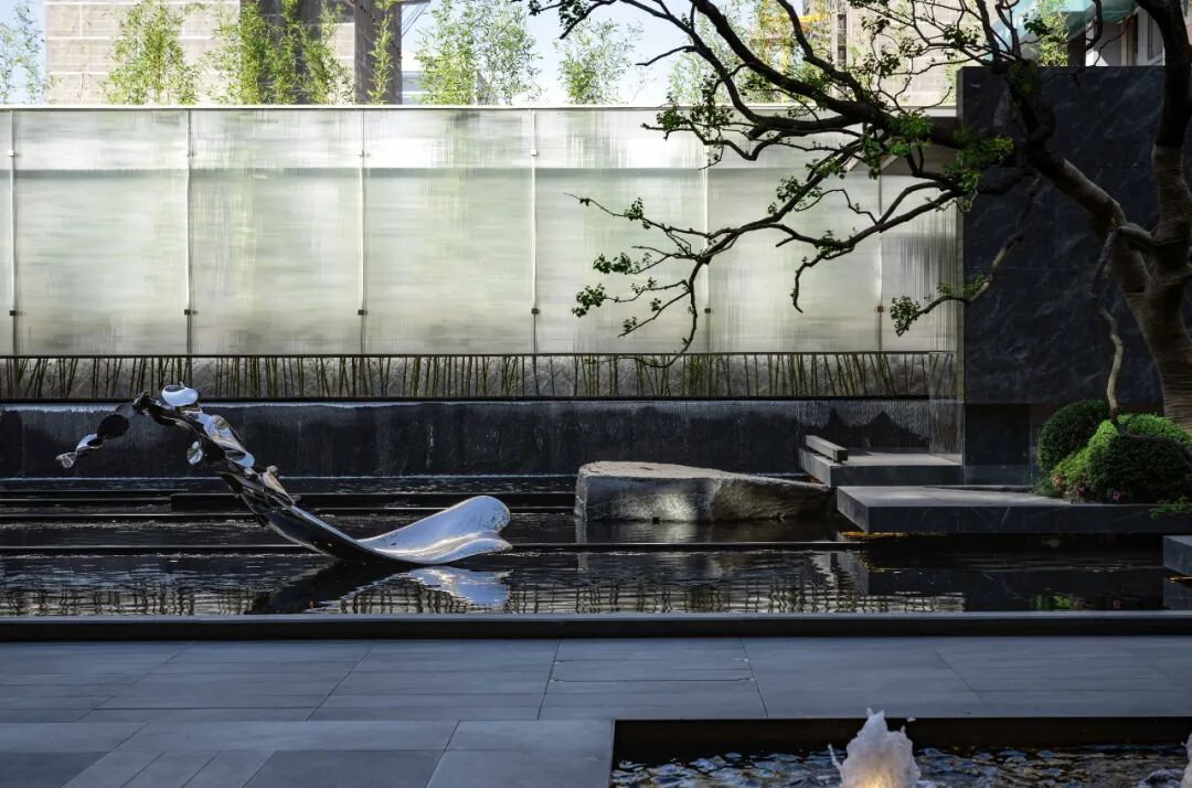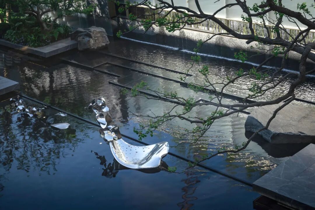进入庭院,开阔洁净的主水面,倒映着抽象犹如飞溅水滴的艺术雕塑,其灵感源于玉兰花瓣的解构设计,配以树池花卉,与蓝天白云相衬映,水流过浅浅跌水台阶,叮咚作响,净化身心。