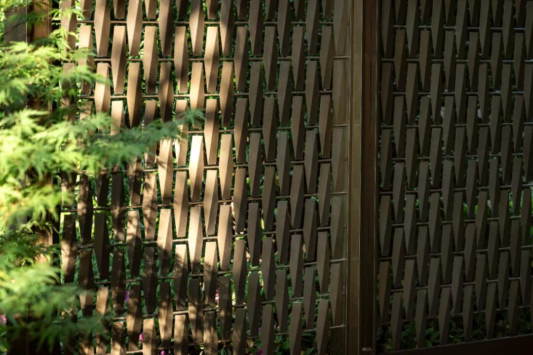 在精致的格栅景墙上,菱形图案被精心雕刻,阳光穿透,形成独特的光影效果,为场地增添了丰富的层次感和视觉冲击力。