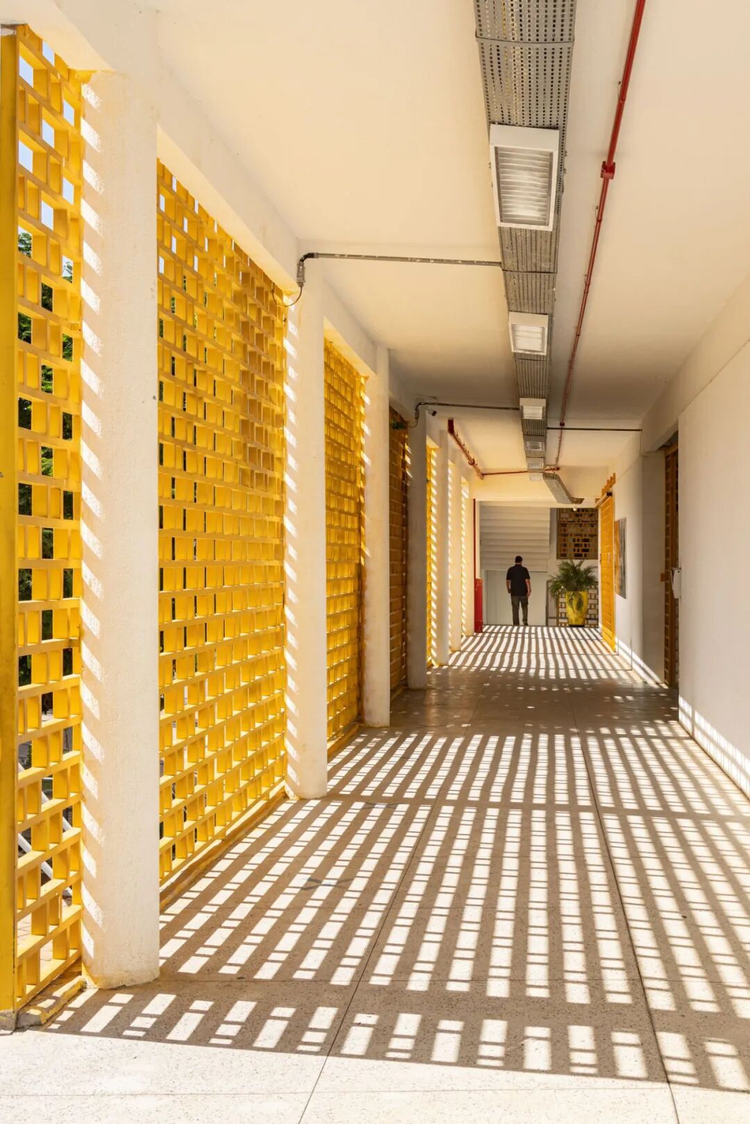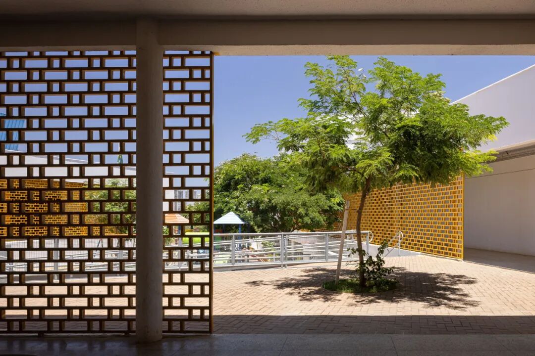 Thermal comfort was one of the main guidelines of the project and for this purpose, a large protection with metal tiles was used on the west facade where the sports court is located. Metallic hollow elements in the circulation areas and concrete cobogós on the roof of the classroom gardens in the children's sector filter the sunlight, alleviating the intense heat in the region. Light trays are present in classrooms and bring natural lighting into the classrooms. Finally, the school has a direct relationship with the street, having been surrounded only by a metal fence, thus preserving visual and wind permeability, making it a very inviting space for parents and students.