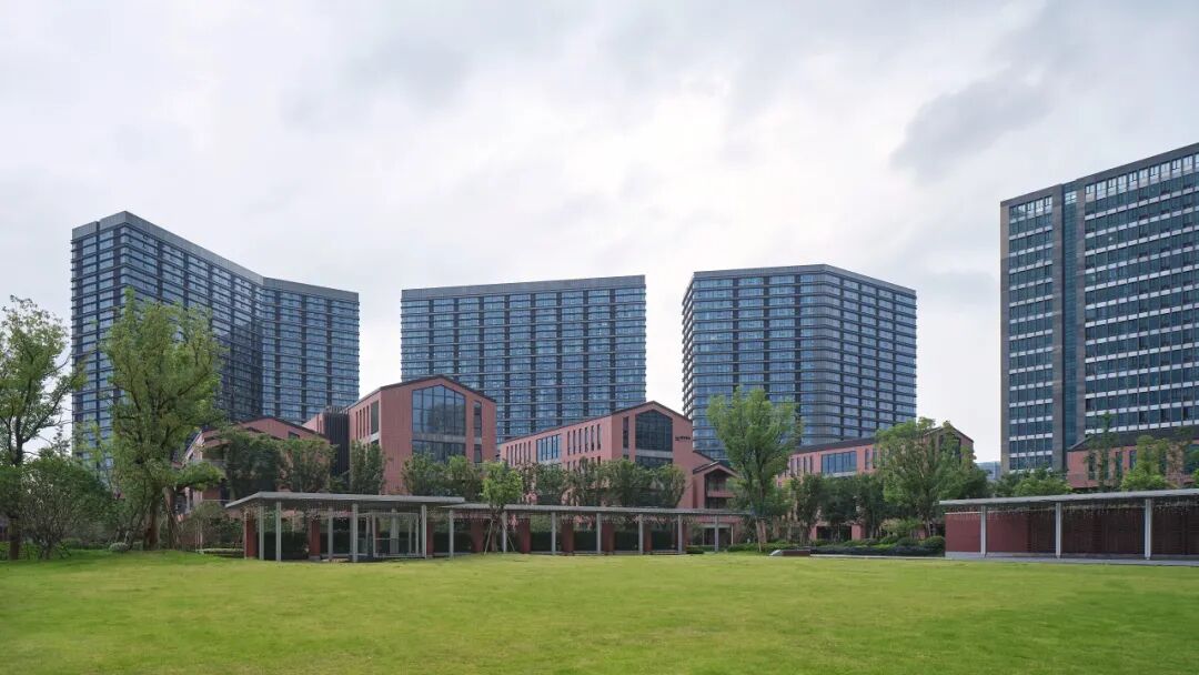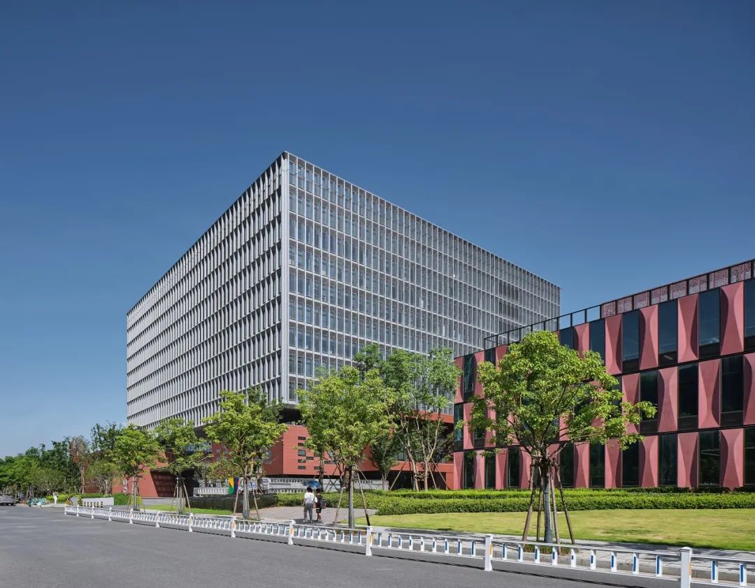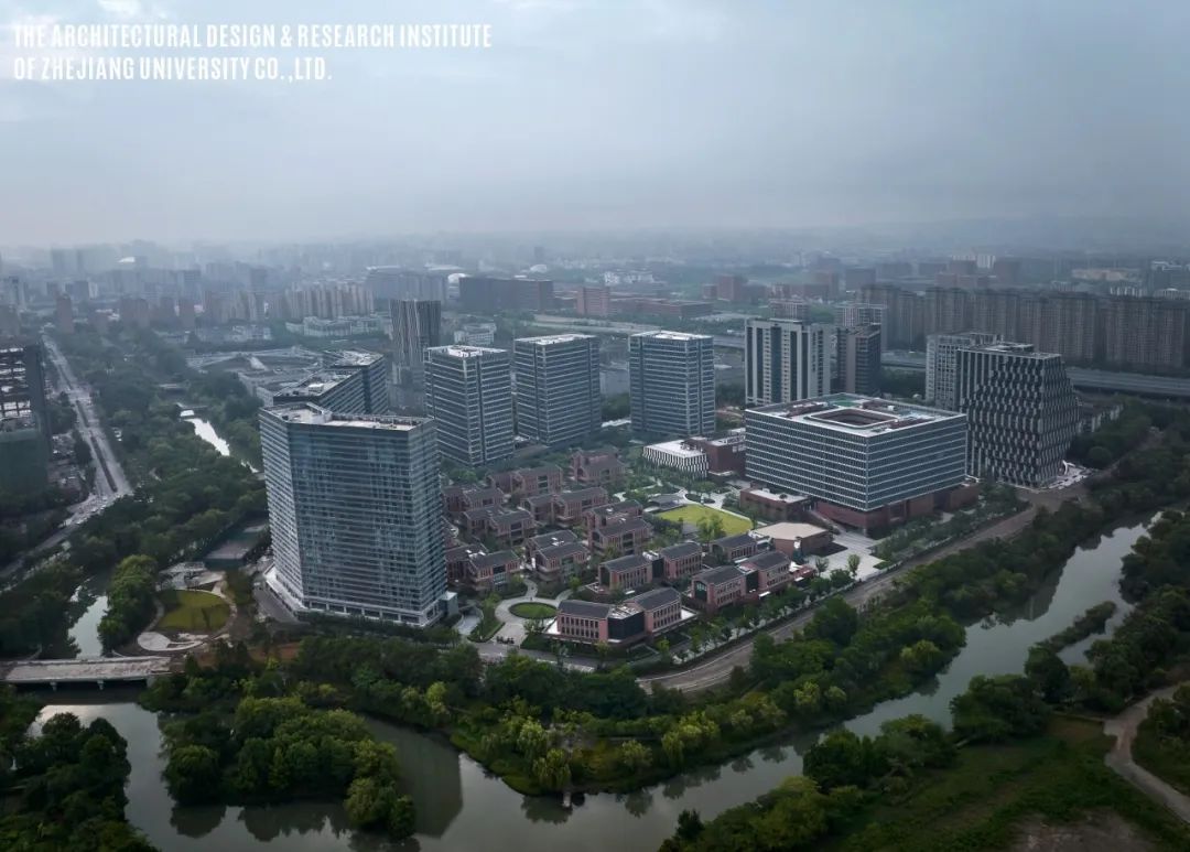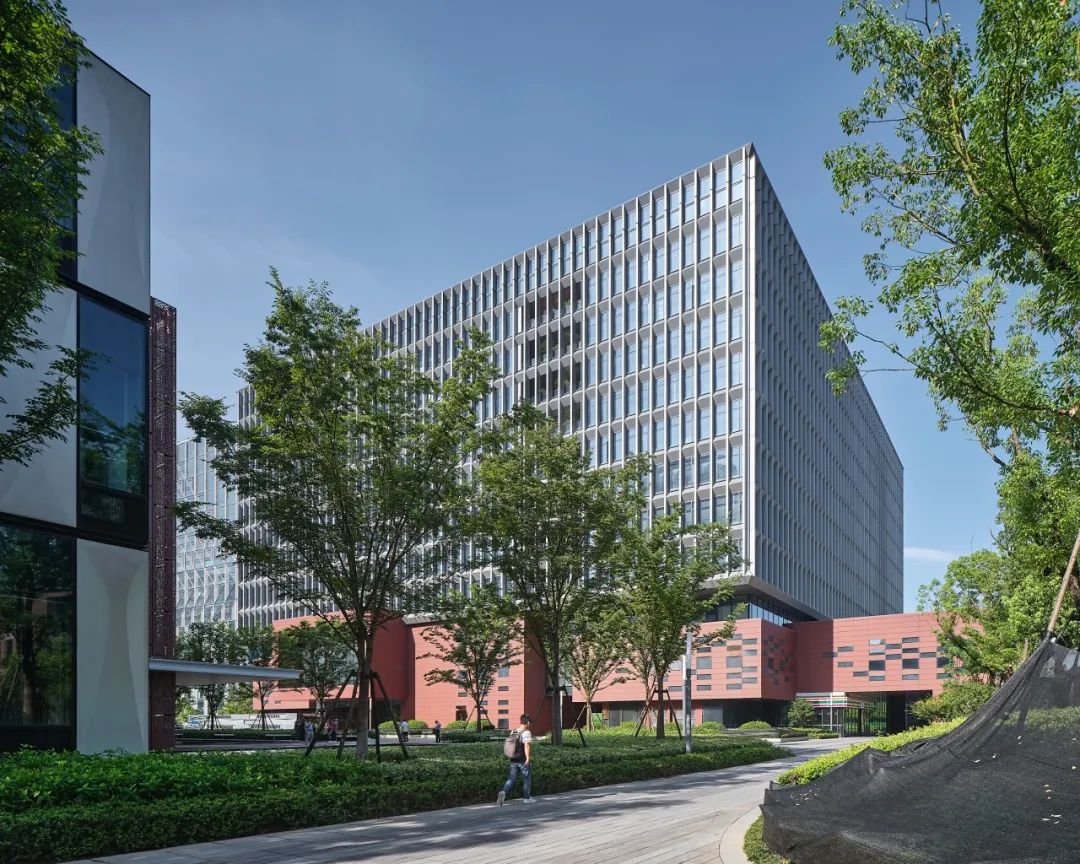 整体建筑群既需要体现现代园区的科技感和时代感,又希望呼应浙江大学“求是红”的传统基因。为此,立面设计和材料选择上采用了上下分离的叠合策略,高层建筑部分主要采用了精致的铝板及幕墙体系,简约时尚,而下部近人尺度的裙房及独栋建筑群落则采用了红色陶板、清水砖等“浙大”元素,细腻优雅,实现了传统与现代在园区融合共生的设计初衷。