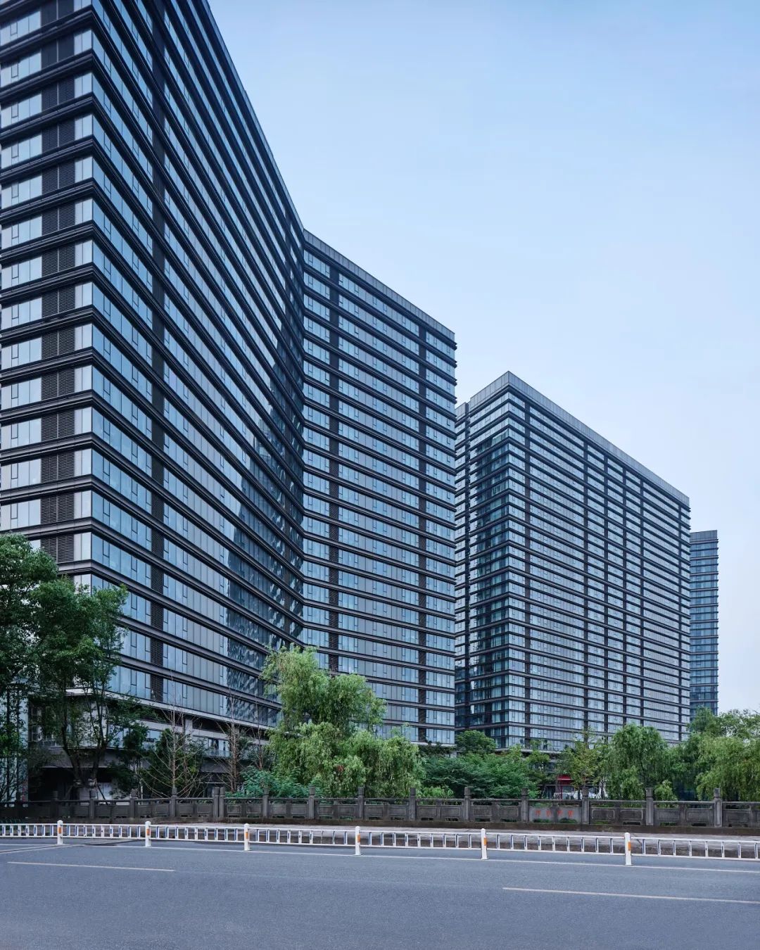 建筑群整体遵循外高内低,外刚内柔的策略——新建高层塔楼及板楼弥合了现状高层办公楼的天际线,并对着西侧开阔的城市界面及河道景观打开,形成了一个巨大的绿色生态“山谷”,小体量的红砖建筑聚落则嵌入山谷内部,与山谷中的绿色景观相融,共同构建了一幅生态、活力、舒适的小镇场景。
