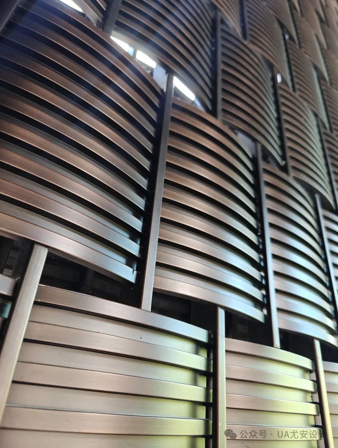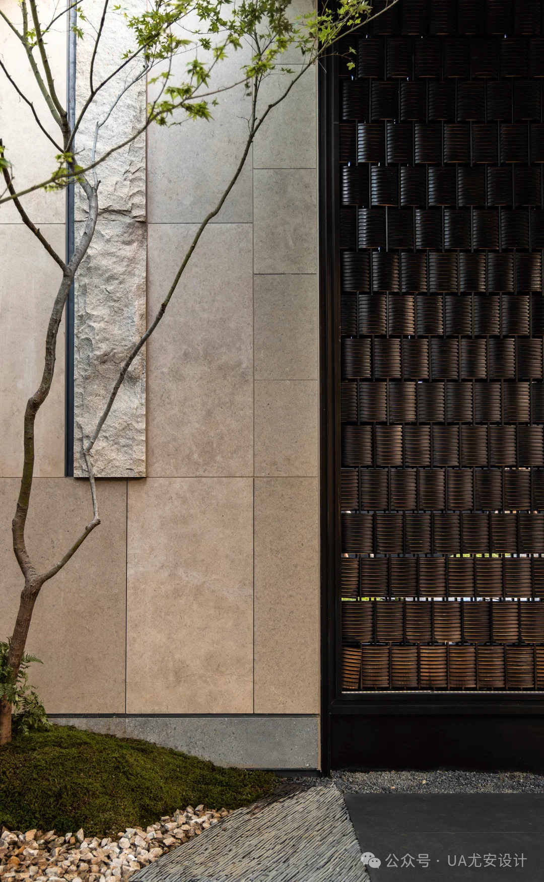 无论是多种石材和金属材质重金打造的入口大门,亦或是12面奢石屏风,以及1008片水波纹铜瓦构成的艺术墙体,亦或是发光玉石、飞瀑石、自然置石等构造的山水真趣,亦或是大面玻璃幕墙的植入,这些材料都不仅在视觉上给人以强烈的冲击,更在触感、听觉甚至是嗅觉上,都让人体验到材质的丰富层次和细腻情感。