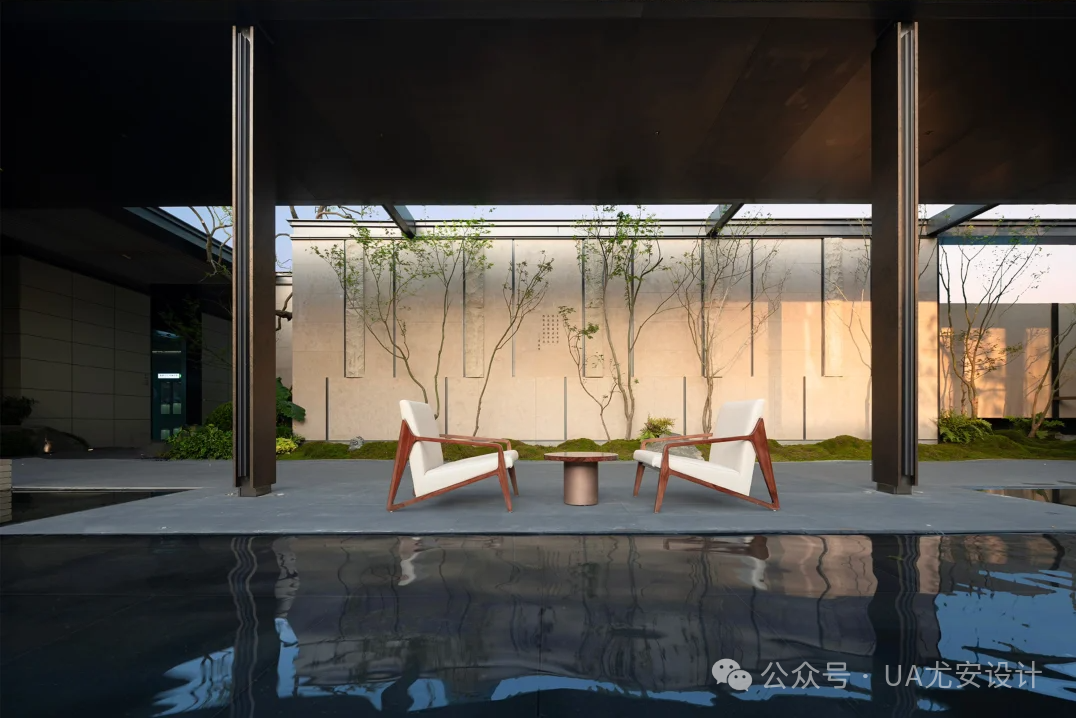 穿过门厅,现代山水园林肆意交织在眼前,沁人心脾的可触温度迎面而来。水域不仅是景观的一部分,更是生活的延伸,它承载着人们对美好生活的向往,让每一个角落都充满温情与诗意。