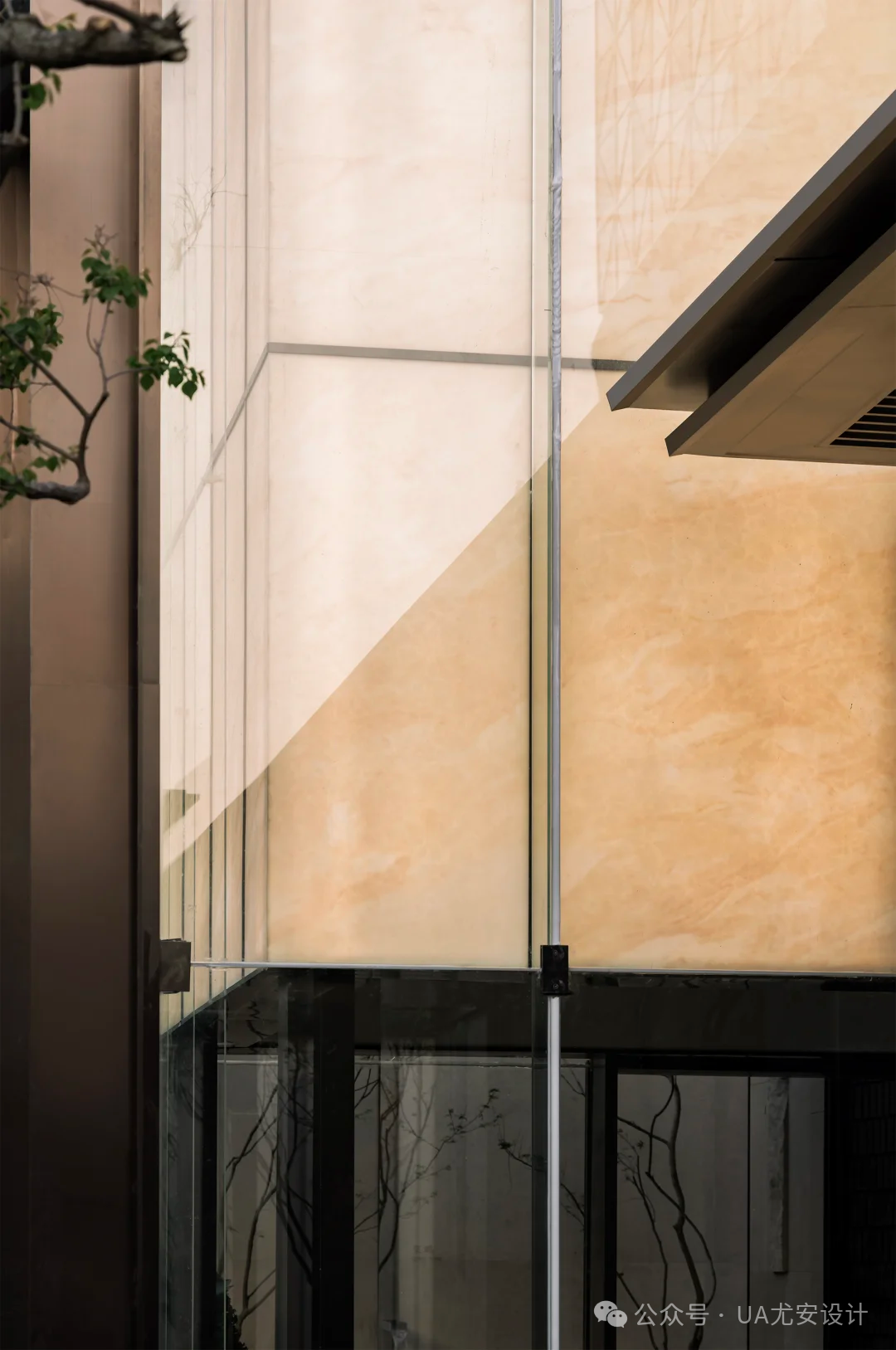 同时,设计师将茶室的空间营造定位为整个生活馆禅意空间的视觉中心,通过灯笼意向的植入,将其打造成为院子的小品,装点视觉焦点。一个由大面积玻璃+透光玉石打造的“孔明灯”般的玉石光盒,奠定了空间的视觉起伏,打破了空间的单调,为访客带来温暖明亮的心灵抚慰。