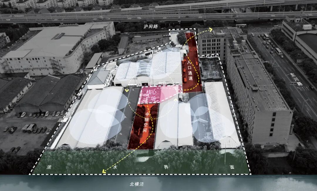 原始状态下园区中场为单纯的通道,空间感受不佳。设计通过削减局部厂房空间,界面进退围合,形成整个场地的中部核心广场,活化内部空间氛围,联通城市及滨水界面。为未来内部产业活动宣发、品牌展陈提供了良好的物理条件。
