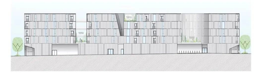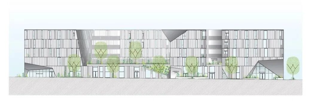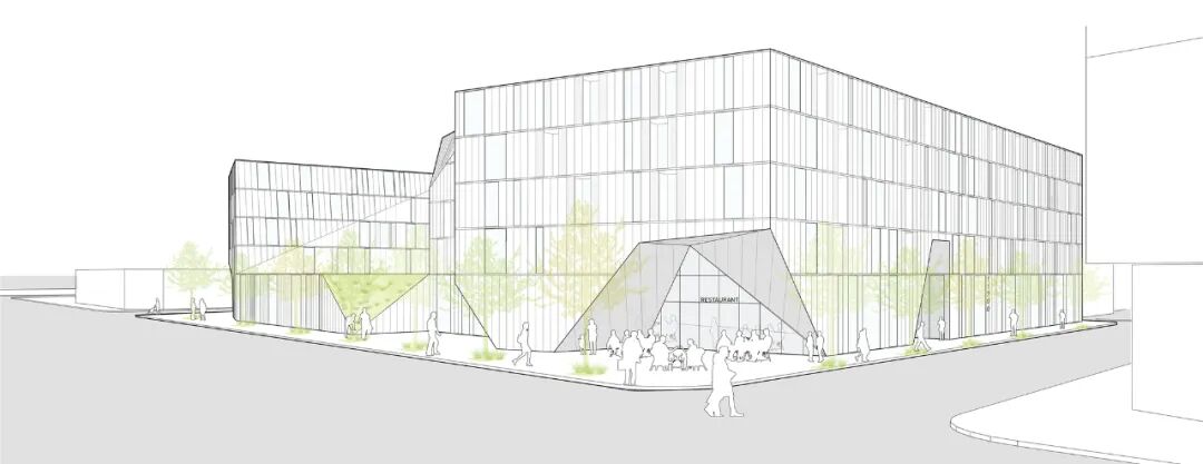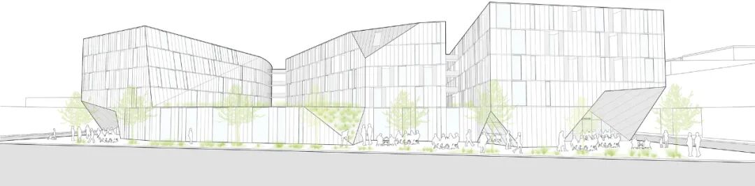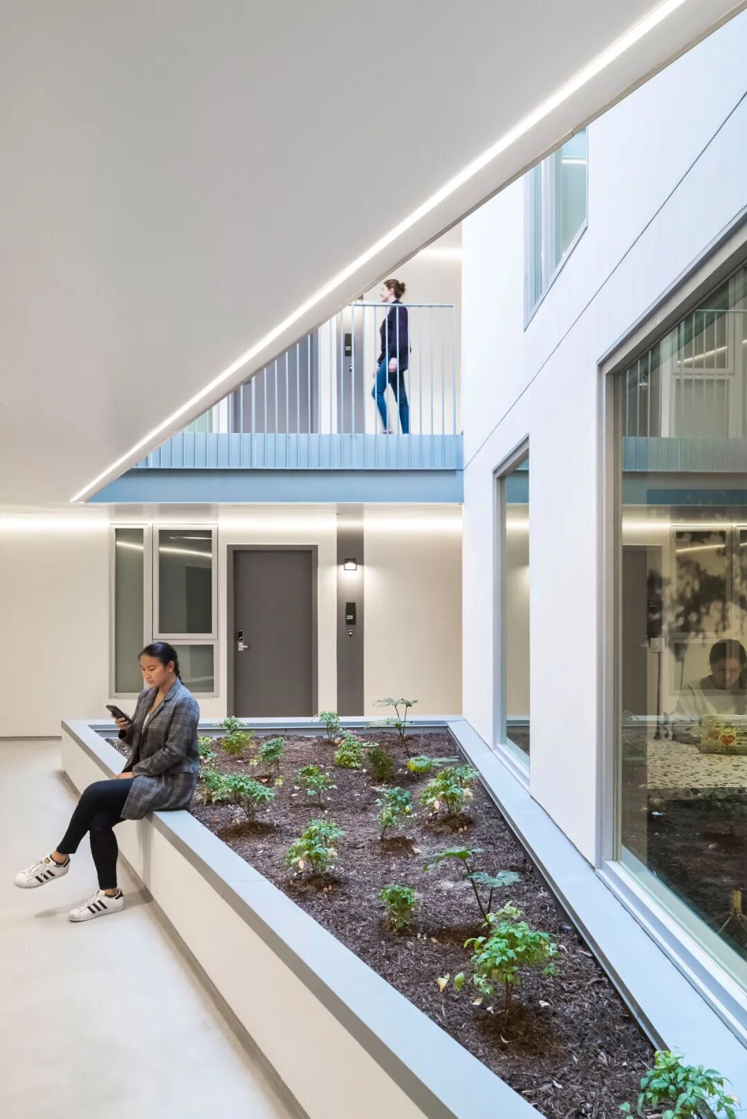 双角镂空以及一对较小的折线将长方形的后退部分分隔开来,形成了三个露天花圃、户外用餐小剧场、长椅和植物。在正上方,一个宽敞的平台连接着三个体量中的两个。这个空隙和另一个较窄的空隙不仅为街道带来了宽敞的空间,也为街道带来了宽敞的空间。裙楼的屋顶线在建筑中心折叠,形成一个景观三角,打破了实体与虚体之间的紧张关系,在商业广场和格兰维尔大道上的大楼梯附近与地面相接。该建筑提供自然通风走廊、雨水管理计划、耐旱植物、高效门窗以及自行车存放处、电动汽车充电站和屋顶太阳能。