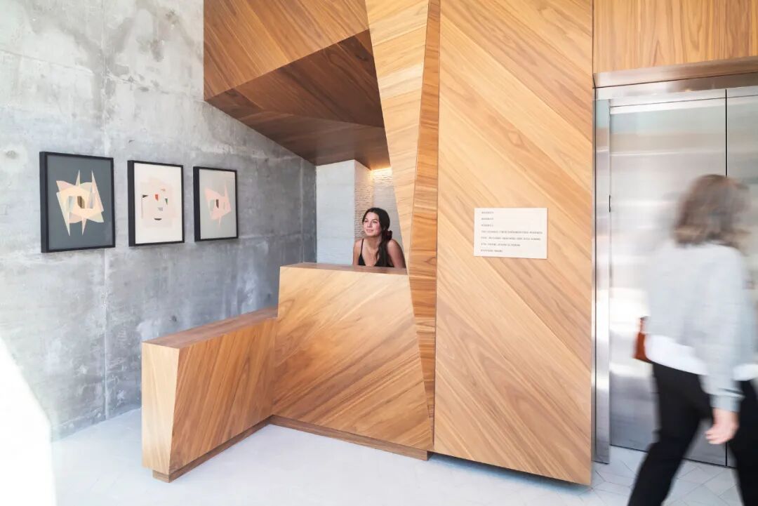 为了方便行人通行,在地面层采用了多种策略将建筑固定在街道上。圣莫尼卡大道上出现了三个低调的楔形体量,而不是一个巨大的、气势恢宏的立面,每个体量都巧妙地与人行道相接。这种提升效果是通过在建筑群的四角设置一系列金字塔形的大型雕刻来实现的,这些雕刻的形状就像倒棱柱。除了为建筑结构下方提供呼吸空间外,这些空隙还将建筑推离了物业线,并拓宽了人行道。