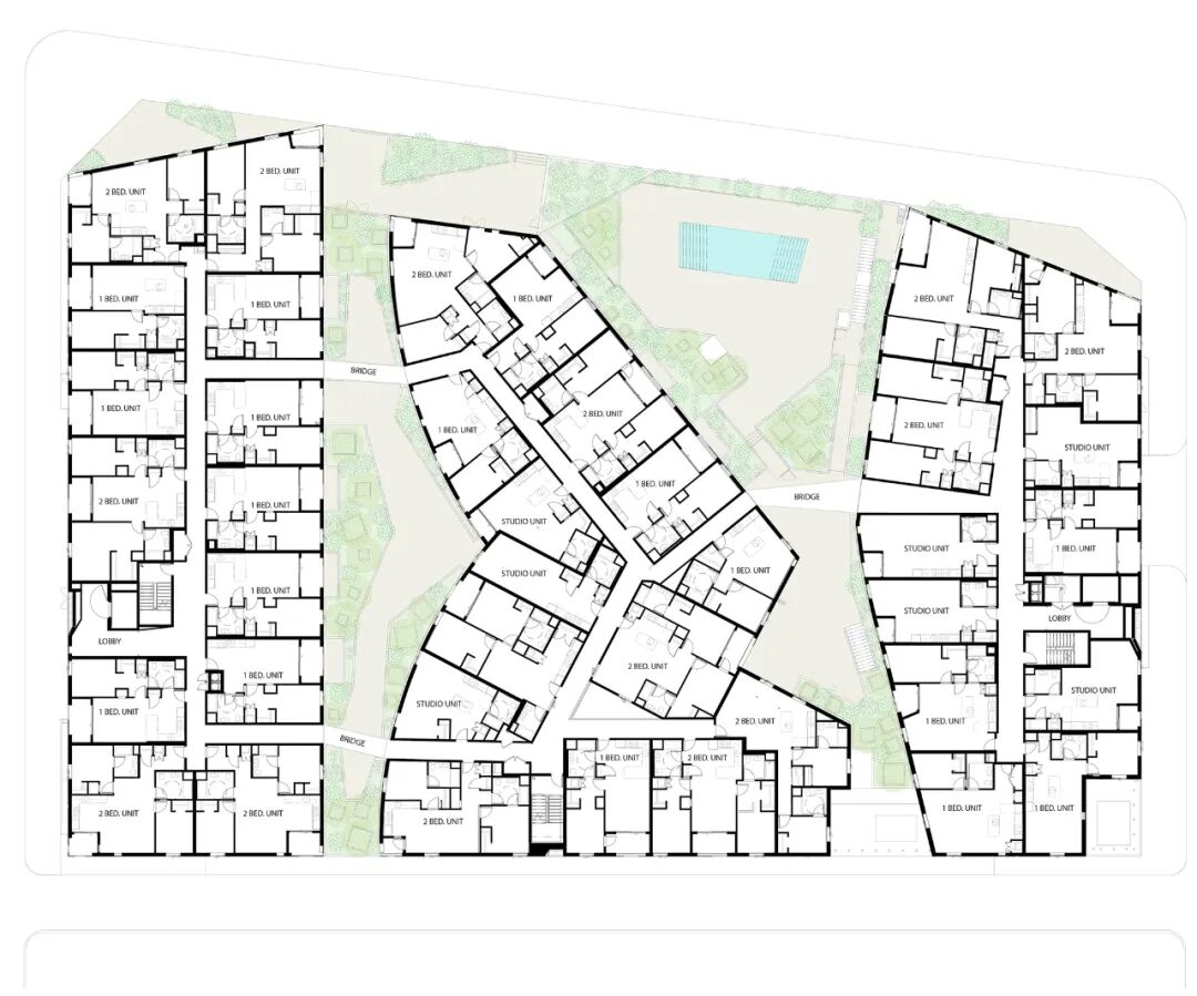 The twin corner cut-aways, along with a pair of smaller folds that bookend a long, rectangular setback, define a trio of open-air parterres, little theaters of outdoor dining, benches, and plantings. Just above, a spacious podium connects two of the three volumes. This void, and another narrower one, bring spaciousness, not just at street level, but above it. The roofline of the podium folds down at the center of the building, in the form of a landscaped triangle, breaking the tension between solid and void by literally touching ground near the commercial plaza and a grand stair on Granville Avenue. The building offers naturally ventilated corridors, a stormwater management plan, drought-tolerant plants, high-efficiency windows and doors, as well as bicycle storage, electric vehicle charging stations, and rooftop solar.