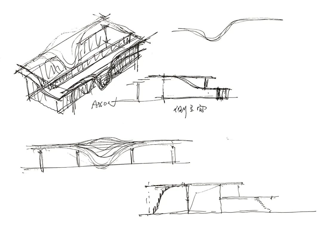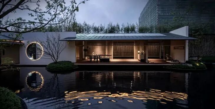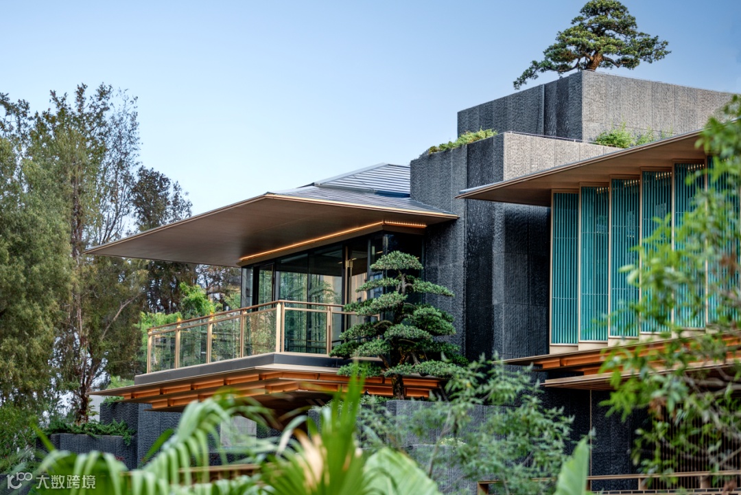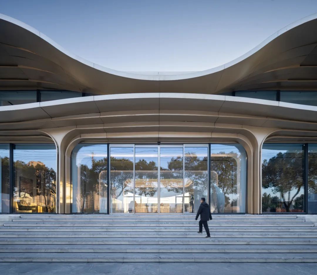 设计团队从宋代建筑中提取歇山顶样式,转译形成深远的挑檐,在视觉效果上给人以棱角分明、结构清晰之感,整体呈现一种清雅内敛的当代气质。