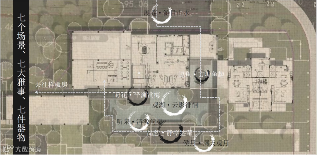 樾青岚人行主入口灵感源自《溪山行旅图》,用登山、探园、观瀑、雅集等九重景观串联整个项目。