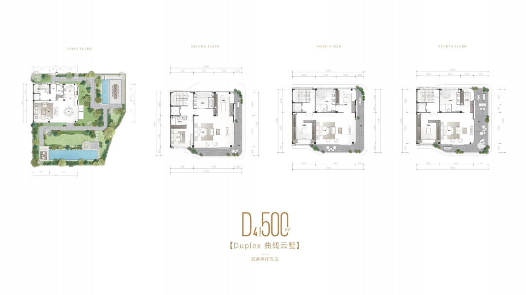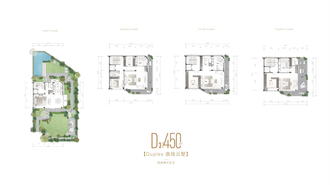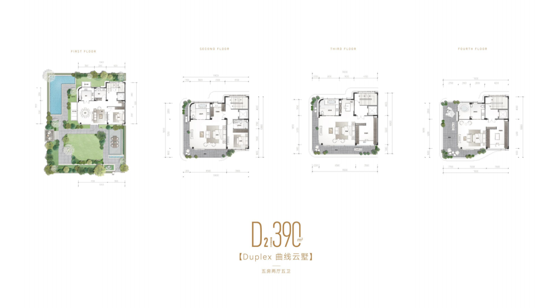 建筑面积约338㎡户型:两层空间设计了五房四套房的格局,并拥有约11.8米的南向面宽。