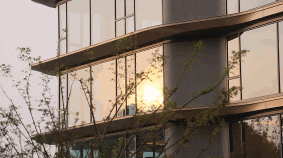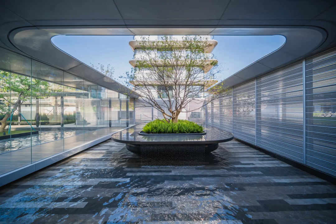 外立面,不仅大面选用落地玻璃,引入远山近水,在整体勾线上则以宋徽宗瘦金体笔锋,用灵动瘦劲的线条撑起利落的框面。