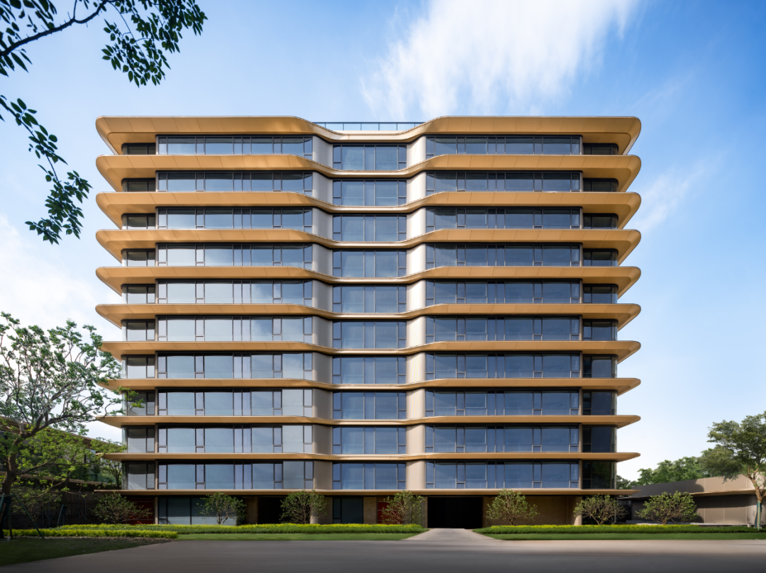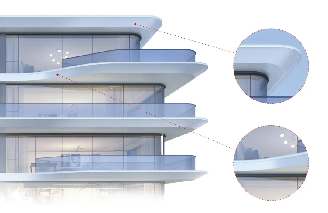 外立面应用第三代金昌曲线,大开大合的三维曲线、变革性双曲铝板、巨幕级通透玻璃,从过往建筑中跳脱而出,代表了面向未来10年甚至更久的审美风尚。专门厂家定制、特殊安装技艺、毫厘级铝板拼接、45cm厚轻盈外悬飞檐、约5%坡度排水设计等“金昌式匠造标准”和超成本投入,让美感与质感并存。