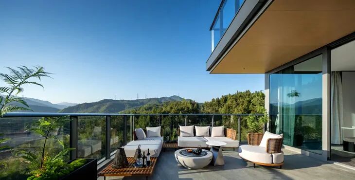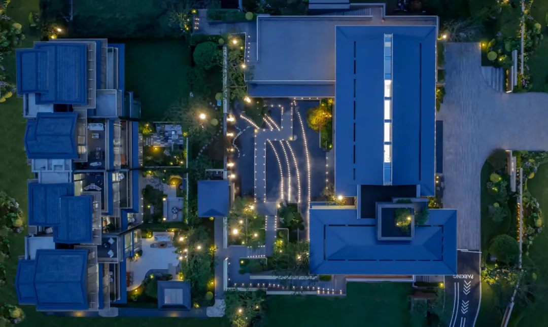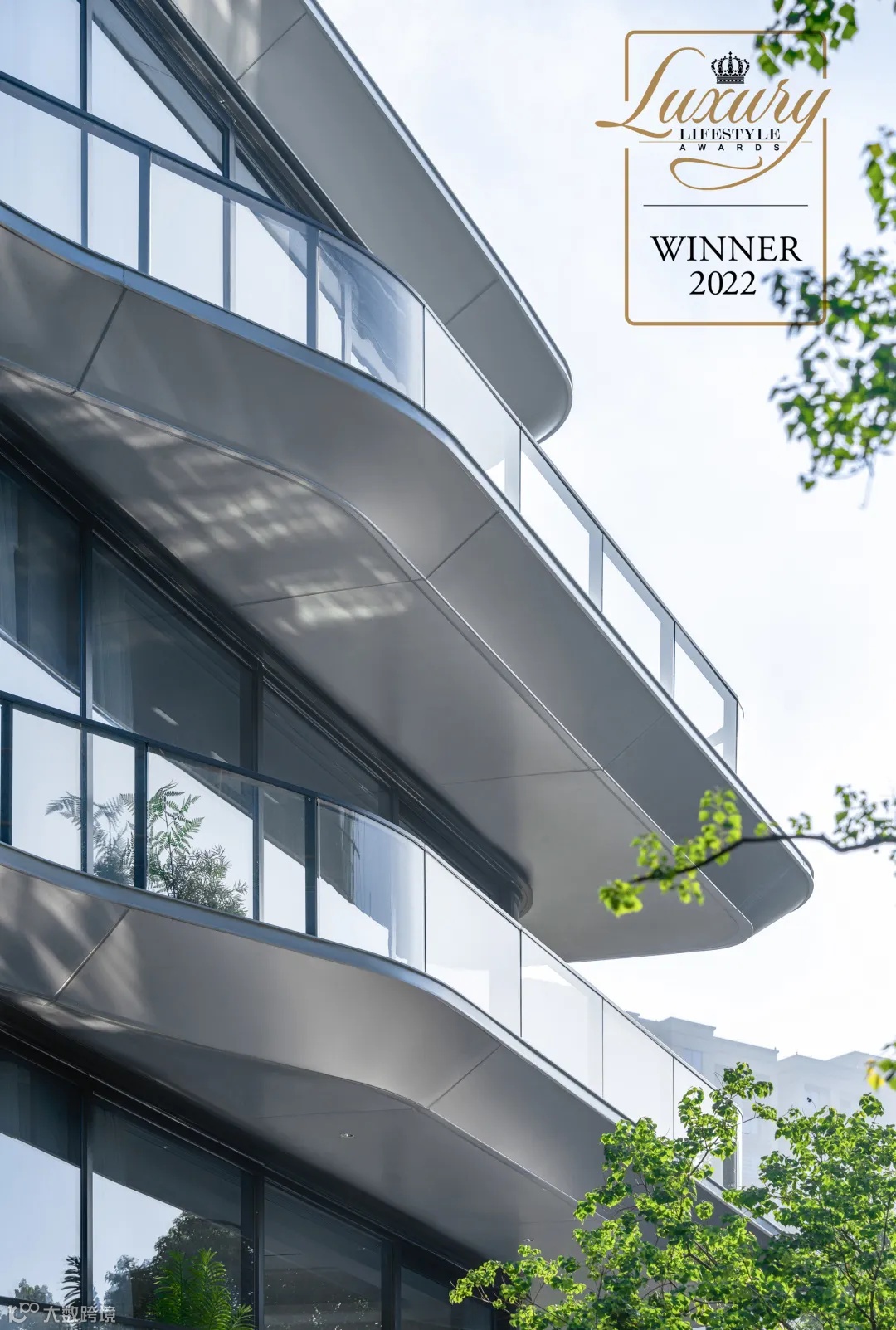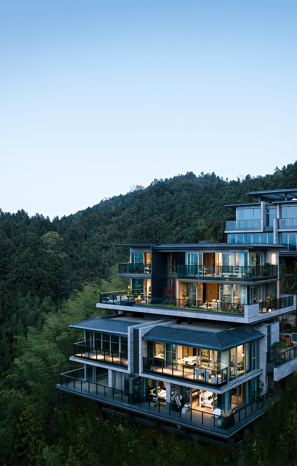 建筑涵盖类独栋、双拼、三联排等型制,汲取东方风骨,以玻璃为主材,让建筑消隐于自然,获得沉浸式体验。