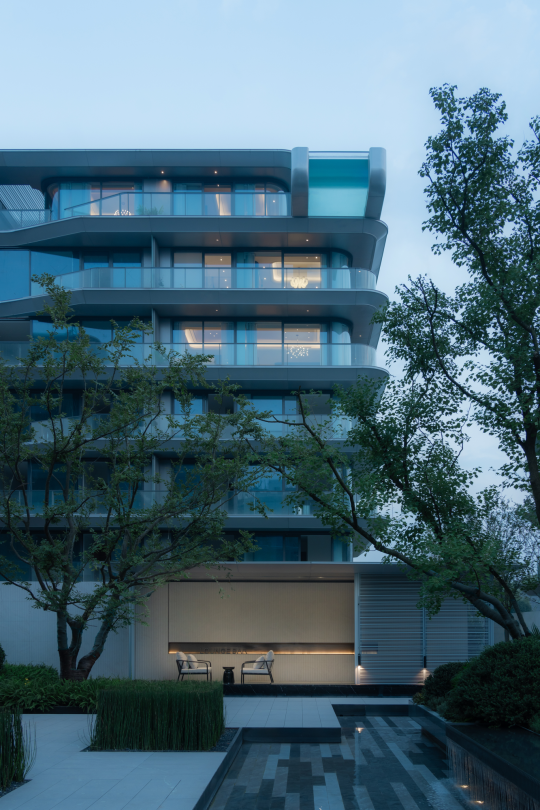 外立面,不仅大面选用落地玻璃,引入远山近水,在整体勾线上则以宋徽宗瘦金体笔锋,用灵动瘦劲的线条撑起利落的框面。