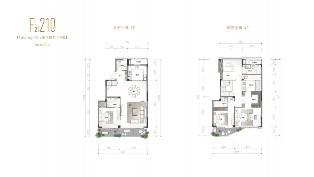 湖前印院,临湖而居、背山面水;而且地块西南侧双面临水。在这个容积率仅约1.3的地块上,龙湖徐徐铺陈了17幢精装叠墅,全盘仅136套;户型更是直接拉到了建筑面积约240-338方,是非常纯粹的高端改善。