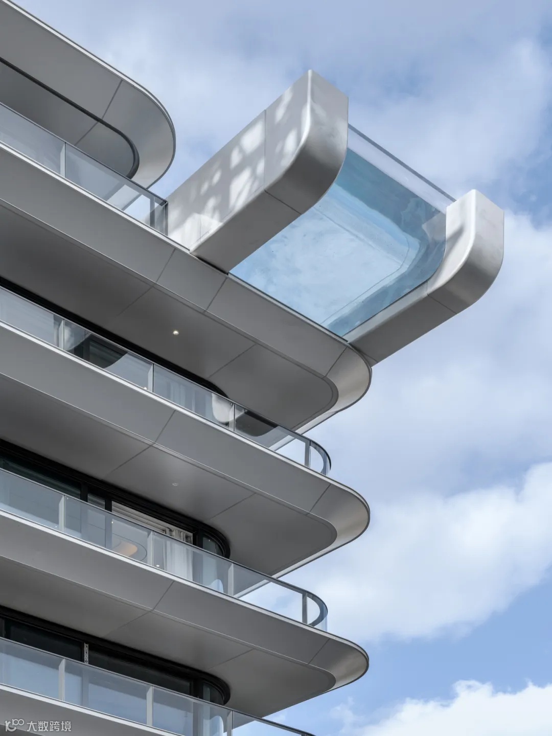外立面应用第三代金昌曲线,大开大合的三维曲线、变革性双曲铝板、巨幕级通透玻璃,从过往建筑中跳脱而出,代表了面向未来10年甚至更久的审美风尚。专门厂家定制、特殊安装技艺、毫厘级铝板拼接、45cm厚轻盈外悬飞檐、约5%坡度排水设计等“金昌式匠造标准”和超成本投入,让美感与质感并存。