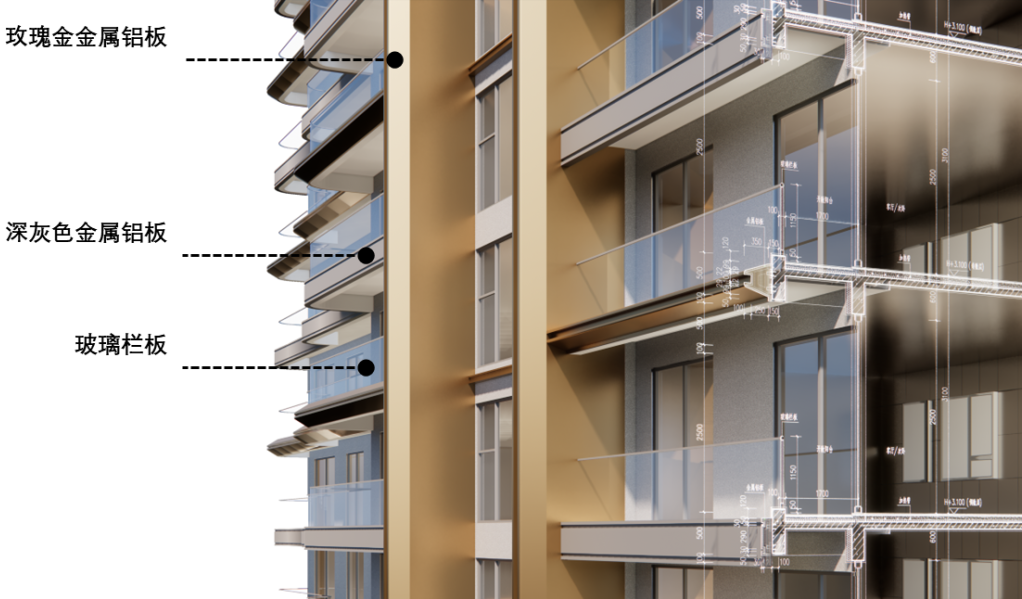 立面横向线脚采用玫瑰金金属铝板+深灰色金属铝板和玻璃栏板,强调精致质感。