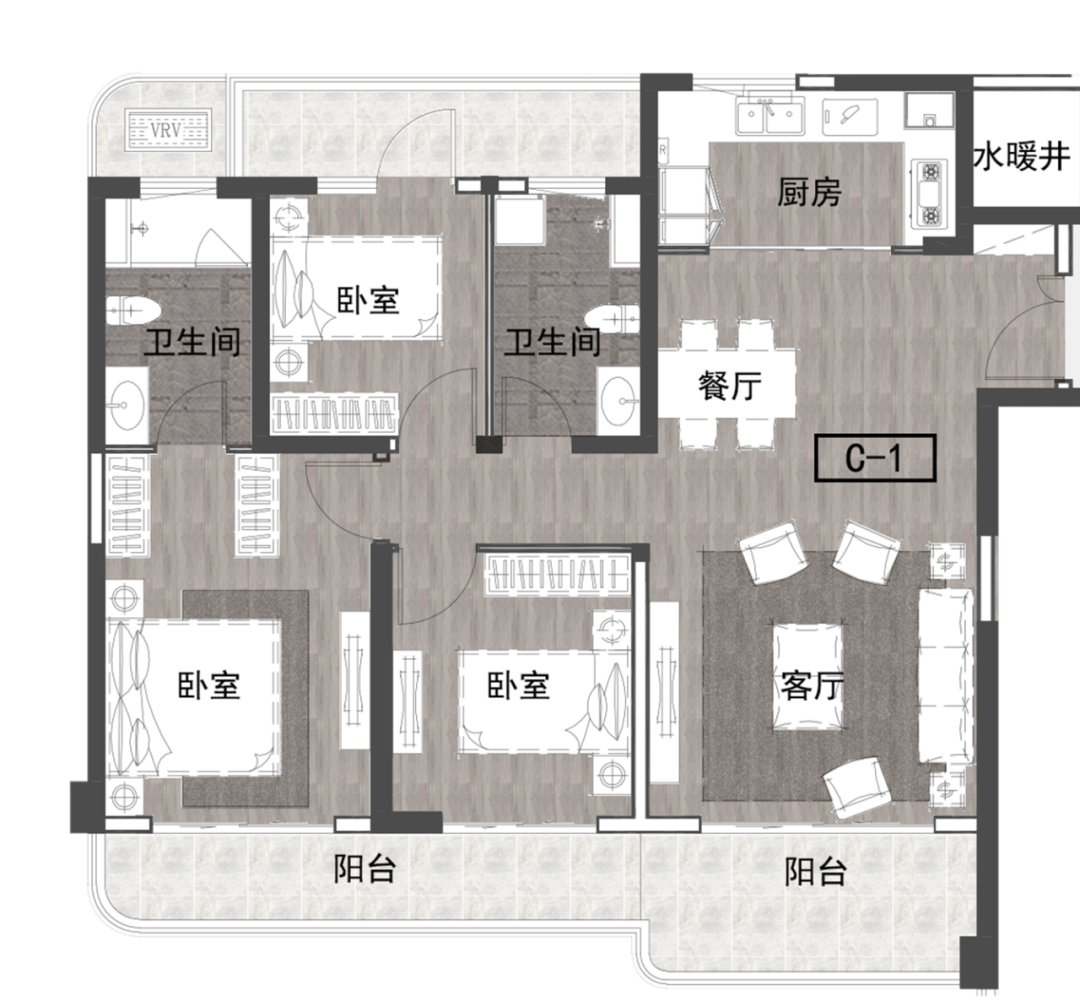 通过餐客横厅以及全面宽的阳台设置,增加动区的空间尺度,增加产品的舒适度。