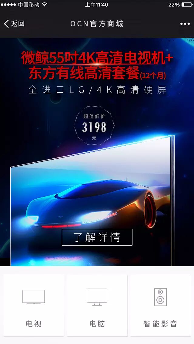 轻松做到——4K高清电视机+东方有线高清套餐,在微信上一键就购,省时省事!