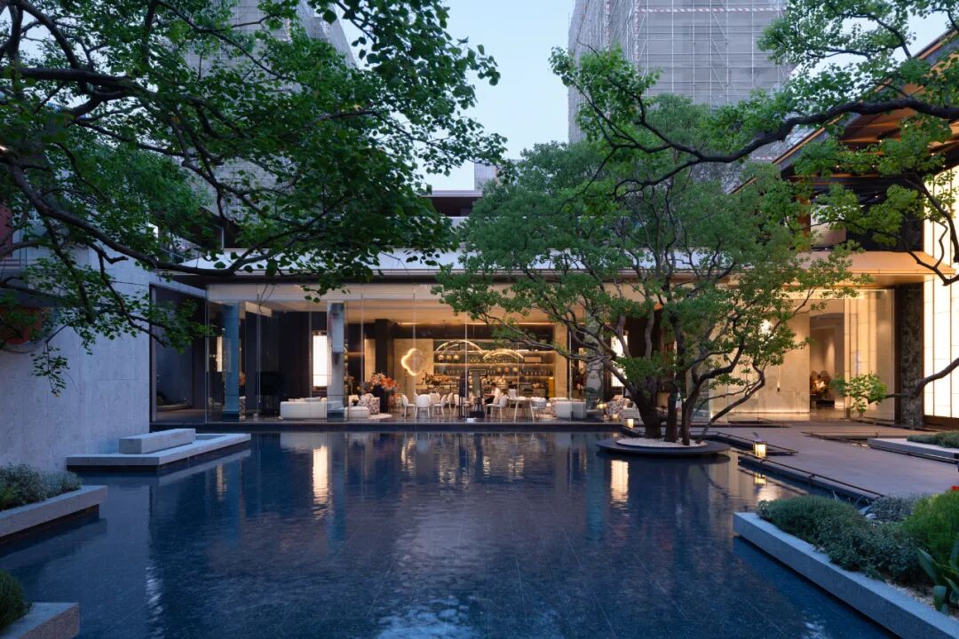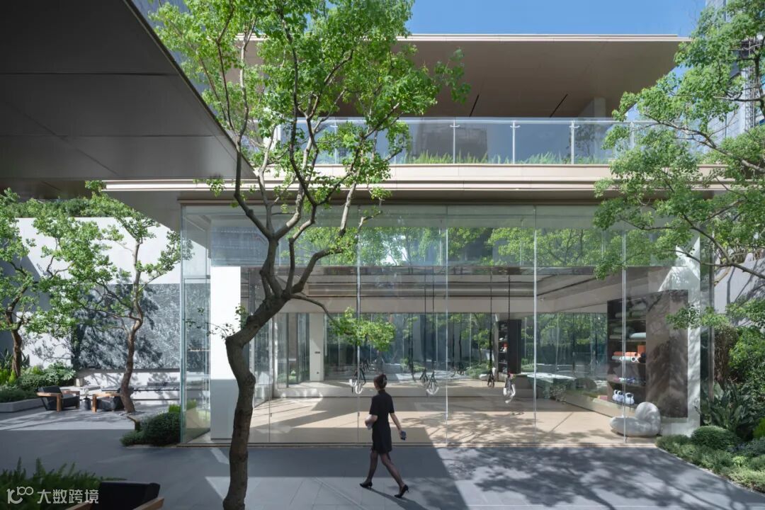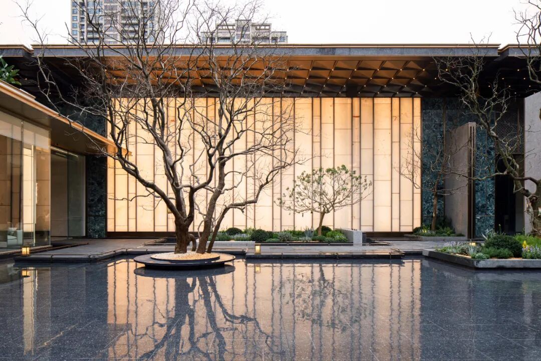 整个动线迂回曲折,三个层次逐步递进,串联起大门、序厅、四水归堂、中心水院、生活馆、垂直电梯厅、瑜伽室、茶室、健身、私宴、架空层、单元门厅展示等功能区域。在围绕着发光石材墙与中心水院的蜿蜒动线,带来了穿行的乐趣:从建筑空间的收放,到园林景观次第转换,再到室内外的穿行以及游廊林下空间的变换。那些多元、交织、洄游的动线流畅地衔接了近、中、远景的渐变,归家即度假的感受在这建筑、景观、空间的转换中自然而生。