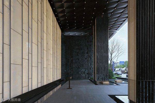 大门为四根对称通高的装饰柱,结合工艺繁琐的奢石拼贴和金属工艺,正面视角柱体材质与发光对景墙呼应;转入其中,柱体侧向的材质又与侧向景墙相呼应。局部增加类似罗马柱的处理,侧面上下两段采用大尺寸的折面肌理,中间为小尺寸折面外加金属压边,上下肌理两两对应。